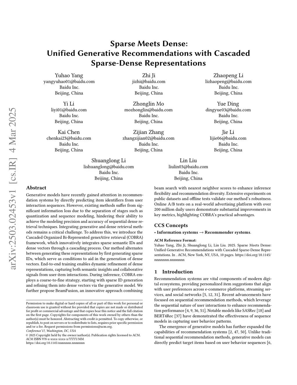 Generative models have recently gained attention in recommendation systems by directly predicting item identifiers from user interaction sequences. However, existing methods suffer from significant information loss due to the separation of stages such as quantization and sequence modeling, hindering their ability to achieve the modeling precision and accuracy of sequential dense retrieval techniques. Integrating generative and dense retrieval methods remains a critical challenge. To address this, we introduce the Cascaded Organized Bi-Represented generAtive retrieval (COBRA) framework, which innovatively integrates sparse semantic IDs and dense vectors through a cascading process. Our method alternates between generating these representations by first generating sparse IDs, which serve as conditions to aid in the generation of dense vectors. End-to-end training enables dynamic refinement of dense representations, capturing both semantic insights and collaborative signals from user-item interactions. During inference, COBRA employs a coarse-to-fine strategy, starting with sparse ID generation and refining them into dense vectors via the generative model. We further propose BeamFusion, an innovative approach combining beam search with nearest neighbor scores to enhance inference flexibility and recommendation diversity. Extensive experiments on public datasets and offline tests validate our method's robustness. Online A/B tests on a real-world advertising platform with over 200 million daily users demonstrate substantial improvements in key metrics, highlighting COBRA's practical advantages.