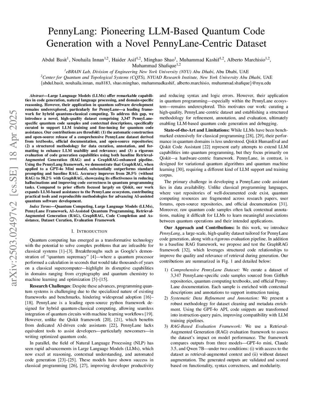 Large Language Models (LLMs) offer powerful capabilities in code generation, natural language understanding, and domain-specific reasoning. Their application to quantum software development remains limited, in part because of the lack of high-quality datasets both for LLM training and as dependable knowledge sources. To bridge this gap, we introduce PennyLang, an off-the-shelf, high-quality dataset of 3,347 PennyLane-specific quantum code samples with contextual descriptions, curated from textbooks, official documentation, and open-source repositories. Our contributions are threefold: (1) the creation and open-source release of PennyLang, a purpose-built dataset for quantum programming with PennyLane; (2) a framework for automated quantum code dataset construction that systematizes curation, annotation, and formatting to maximize downstream LLM usability; and (3) a baseline evaluation of the dataset across multiple open-source models, including ablation studies, all conducted within a retrieval-augmented generation (RAG) pipeline. Using PennyLang with RAG substantially improves performance: for example, Qwen 7B's success rate rises from 8.7% without retrieval to 41.7% with full-context augmentation, and LLaMa 4 improves from 78.8% to 84.8%, while also reducing hallucinations and enhancing quantum code correctness. Moving beyond Qiskit-focused studies, we bring LLM-based tools and reproducible methods to PennyLane for advancing AI-assisted quantum development.