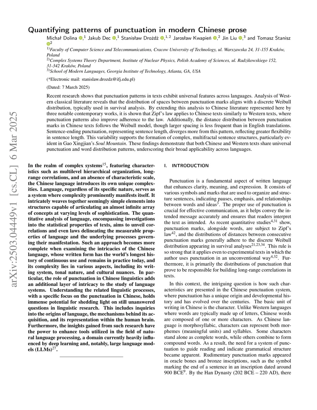 Recent research shows that punctuation patterns in texts exhibit universal features across languages. Analysis of Western classical literature reveals that the distribution of spaces between punctuation marks aligns with a discrete Weibull distribution, typically used in survival analysis. By extending this analysis to Chinese literature represented here by three notable contemporary works, it is shown that Zipf's law applies to Chinese texts similarly to Western texts, where punctuation patterns also improve adherence to the law. Additionally, the distance distribution between punctuation marks in Chinese texts follows the Weibull model, though larger spacing is less frequent than in English translations. Sentence-ending punctuation, representing sentence length, diverges more from this pattern, reflecting greater flexibility in sentence length. This variability supports the formation of complex, multifractal sentence structures, particularly evident in Gao Xingjian's "Soul Mountain". These findings demonstrate that both Chinese and Western texts share universal punctuation and word distribution patterns, underscoring their broad applicability across languages.