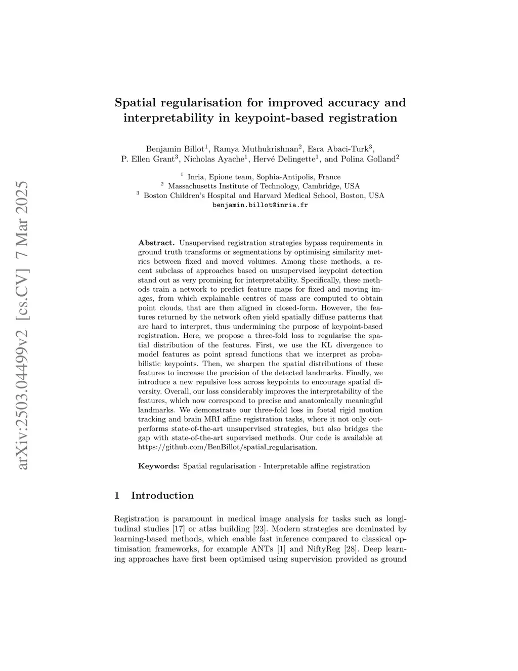 Unsupervised registration strategies bypass requirements in ground truth transforms or segmentations by optimising similarity metrics between fixed and moved volumes. Among these methods, a recent subclass of approaches based on unsupervised keypoint detection stand out as very promising for interpretability. Specifically, these methods train a network to predict feature maps for fixed and moving images, from which explainable centres of mass are computed to obtain point clouds, that are then aligned in closed-form. However, the features returned by the network often yield spatially diffuse patterns that are hard to interpret, thus undermining the purpose of keypoint-based registration. Here, we propose a three-fold loss to regularise the spatial distribution of the features. First, we use the KL divergence to model features as point spread functions that we interpret as probabilistic keypoints. Then, we sharpen the spatial distributions of these features to increase the precision of the detected landmarks. Finally, we introduce a new repulsive loss across keypoints to encourage spatial diversity. Overall, our loss considerably improves the interpretability of the features, which now correspond to precise and anatomically meaningful landmarks. We demonstrate our three-fold loss in foetal rigid motion tracking and brain MRI affine registration tasks, where it not only outperforms state-of-the-art unsupervised strategies, but also bridges the gap with state-of-the-art supervised methods. Our code is available atthis https URL.
