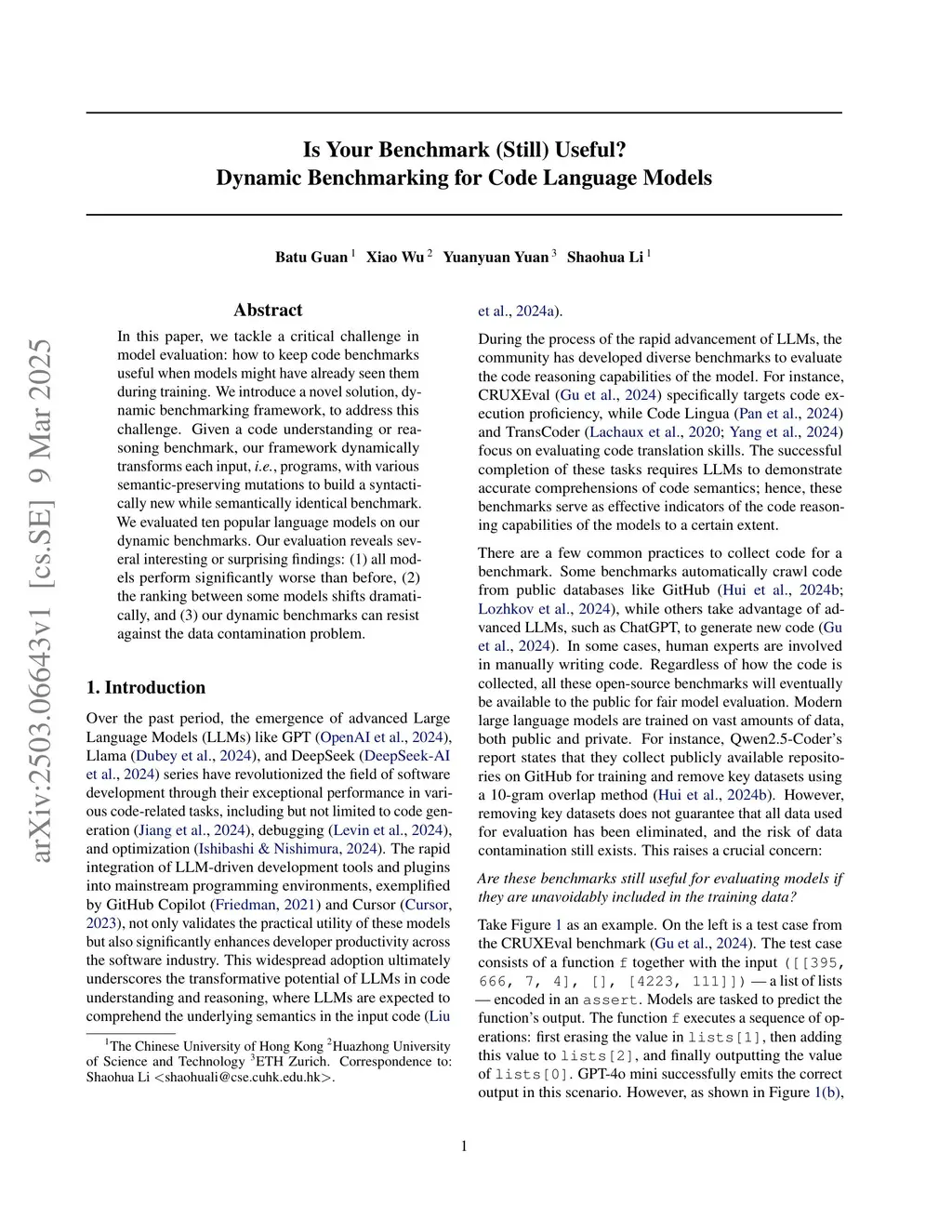 In this paper, we tackle a critical challenge in model evaluation: how to keep code benchmarks useful when models might have already seen them during training. We introduce a novel solution, dynamic benchmarking framework, to address this challenge. Given a code understanding or reasoning benchmark, our framework dynamically transforms each input, i.e., programs, with various semantic-preserving mutations to build a syntactically new while semantically identical benchmark. We evaluated ten popular language models on our dynamic benchmarks. Our evaluation reveals several interesting or surprising findings: (1) all models perform significantly worse than before, (2) the ranking between some models shifts dramatically, and (3) our dynamic benchmarks can resist against the data contamination problem.