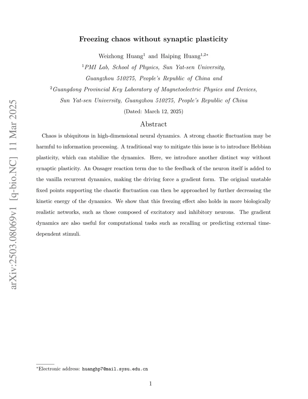 Chaos is ubiquitous in high-dimensional neural dynamics. A strong chaotic fluctuation may be harmful to information processing. A traditional way to mitigate this issue is to introduce Hebbian plasticity, which can stabilize the dynamics. Here, we introduce another distinct way without synaptic plasticity. An Onsager reaction term due to the feedback of the neuron itself is added to the vanilla recurrent dynamics, making the driving force a gradient form. The original unstable fixed points supporting the chaotic fluctuation can then be approached by further decreasing the kinetic energy of the dynamics. We show that this freezing effect also holds in more biologically realistic networks, such as those composed of excitatory and inhibitory neurons. The gradient dynamics are also useful for computational tasks such as recalling or predicting external time-dependent stimuli.