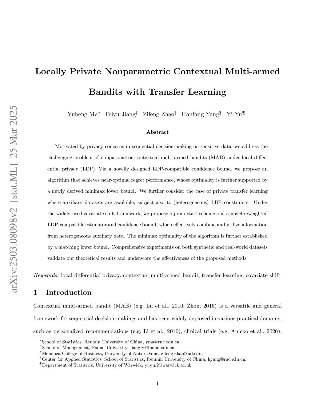 Motivated by privacy concerns in sequential decision-making on sensitive data, we address the challenge of nonparametric contextual multi-armed bandits (MAB) under local differential privacy (LDP). We develop a uniform-confidence-bound-type estimator, showing its minimax optimality supported by a matching minimax lower bound. We further consider the case where auxiliary datasets are available, subject also to (possibly heterogeneous) LDP constraints. Under the widely-used covariate shift framework, we propose a jump-start scheme to effectively utilize the auxiliary data, the minimax optimality of which is further established by a matching lower bound. Comprehensive experiments on both synthetic and real-world datasets validate our theoretical results and underscore the effectiveness of the proposed methods.