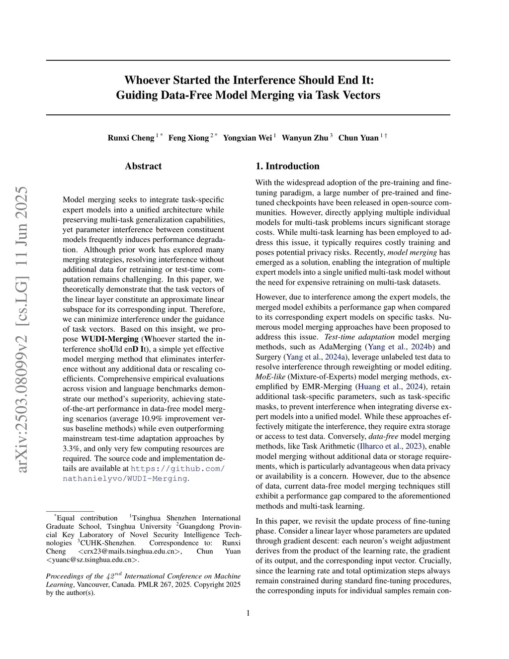 Model merging seeks to integrate task-specific expert models into a unified architecture while preserving multi-task generalization capabilities, yet parameter interference between constituent models frequently induces performance degradation. Although prior work has explored many merging strategies, resolving interference without additional data for retraining or test-time computation remains challenging. In this paper, we theoretically demonstrate that the task vectors of the linear layer constitute an approximate linear subspace for its corresponding input. Therefore, we can minimize interference under the guidance of task vectors. Based on this insight, we propose \textbf{WUDI-Merging} (\textbf{W}hoever started the interference sho\textbf{U}ld en\textbf{D} \textbf{I}t), a simple yet effective model merging method that eliminates interference without any additional data or rescaling coefficients. Comprehensive empirical evaluations across vision and language benchmarks demonstrate our method's superiority, achieving state-of-the-art performance in data-free model merging scenarios (average 10.9\% improvement versus baseline methods) while even outperforming mainstream test-time adaptation approaches by 3.3\%, and only very few computing resources are required. The code will be publicly available soon.