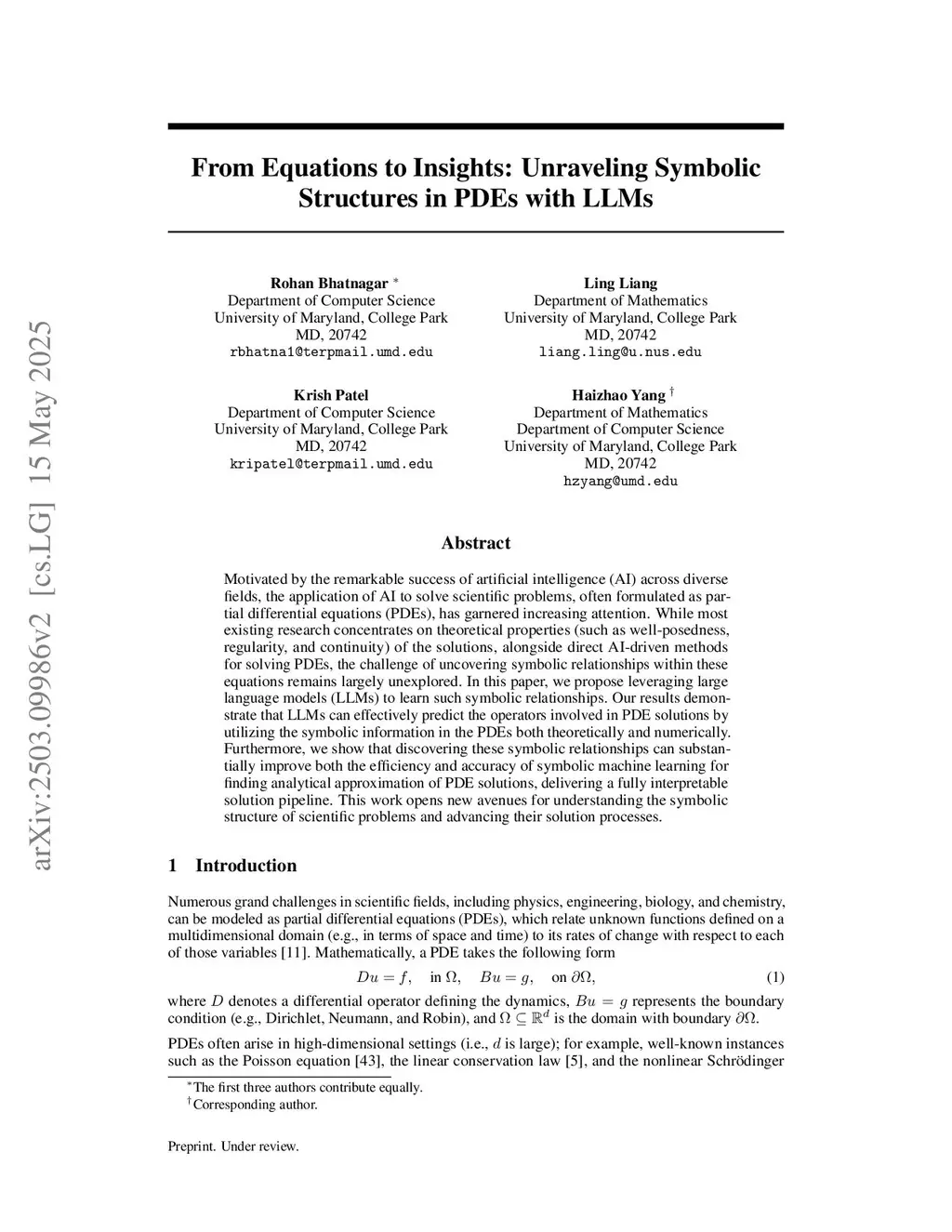 Motivated by the remarkable success of artificial intelligence (AI) across diverse fields, the application of AI to solve scientific problems, often formulated as partial differential equations (PDEs), has garnered increasing attention. While most existing research concentrates on theoretical properties (such as well-posedness, regularity, and continuity) of the solutions, alongside direct AI-driven methods for solving PDEs, the challenge of uncovering symbolic relationships within these equations remains largely unexplored. In this paper, we propose leveraging large language models (LLMs) to learn such symbolic relationships. Our results demonstrate that LLMs can effectively predict the operators involved in PDE solutions by utilizing the symbolic information in the PDEs both theoretically and numerically. Furthermore, we show that discovering these symbolic relationships can substantially improve both the efficiency and accuracy of symbolic machine learning for finding analytical approximation of PDE solutions, delivering a fully interpretable solution pipeline. This work opens new avenues for understanding the symbolic structure of scientific problems and advancing their solution processes.