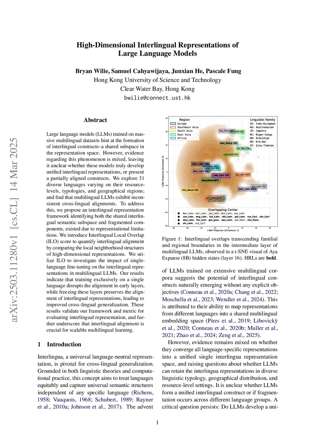 Large language models (LLMs) trained on massive multilingual datasets hint at the formation of interlingual constructs--a shared subspace in the representation space. However, evidence regarding this phenomenon is mixed, leaving it unclear whether these models truly develop unified interlingual representations, or present a partially aligned constructs. We explore 31 diverse languages varying on their resource-levels, typologies, and geographical regions; and find that multilingual LLMs exhibit inconsistent cross-lingual alignments. To address this, we propose an interlingual representation framework identifying both the shared interlingual semantic subspace and fragmented components, existed due to representational limitations. We introduce Interlingual Local Overlap (ILO) score to quantify interlingual alignment by comparing the local neighborhood structures of high-dimensional representations. We utilize ILO to investigate the impact of single-language fine-tuning on the interlingual representations in multilingual LLMs. Our results indicate that training exclusively on a single language disrupts the alignment in early layers, while freezing these layers preserves the alignment of interlingual representations, leading to improved cross-lingual generalization. These results validate our framework and metric for evaluating interlingual representation, and further underscore that interlingual alignment is crucial for scalable multilingual learning.