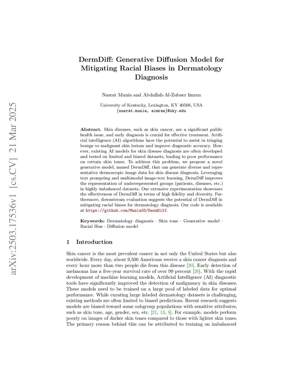 Skin diseases, such as skin cancer, are a significant public health issue, and early diagnosis is crucial for effective treatment. Artificial intelligence (AI) algorithms have the potential to assist in triaging benign vs malignant skin lesions and improve diagnostic accuracy. However, existing AI models for skin disease diagnosis are often developed and tested on limited and biased datasets, leading to poor performance on certain skin tones. To address this problem, we propose a novel generative model, named DermDiff, that can generate diverse and representative dermoscopic image data for skin disease diagnosis. Leveraging text prompting and multimodal image-text learning, DermDiff improves the representation of underrepresented groups (patients, diseases, etc.) in highly imbalanced datasets. Our extensive experimentation showcases the effectiveness of DermDiff in terms of high fidelity and diversity. Furthermore, downstream evaluation suggests the potential of DermDiff in mitigating racial biases for dermatology diagnosis. Our code is available atthis https URL