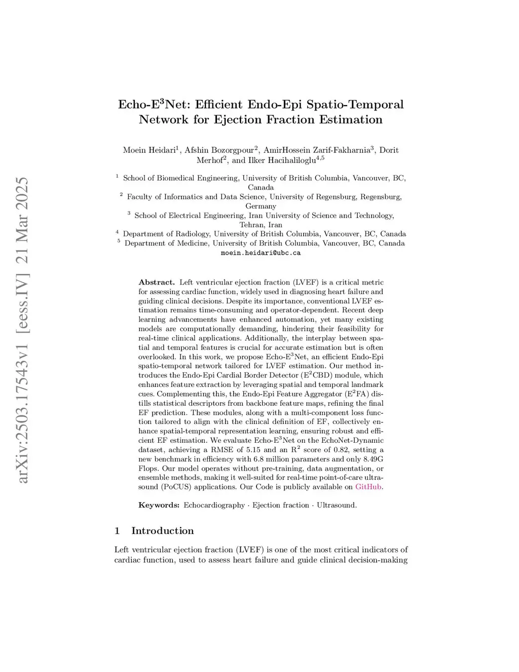 Echo-ENet: Efficient Endocardial Spatio-Temporal Network for Ejection Fraction Estimation