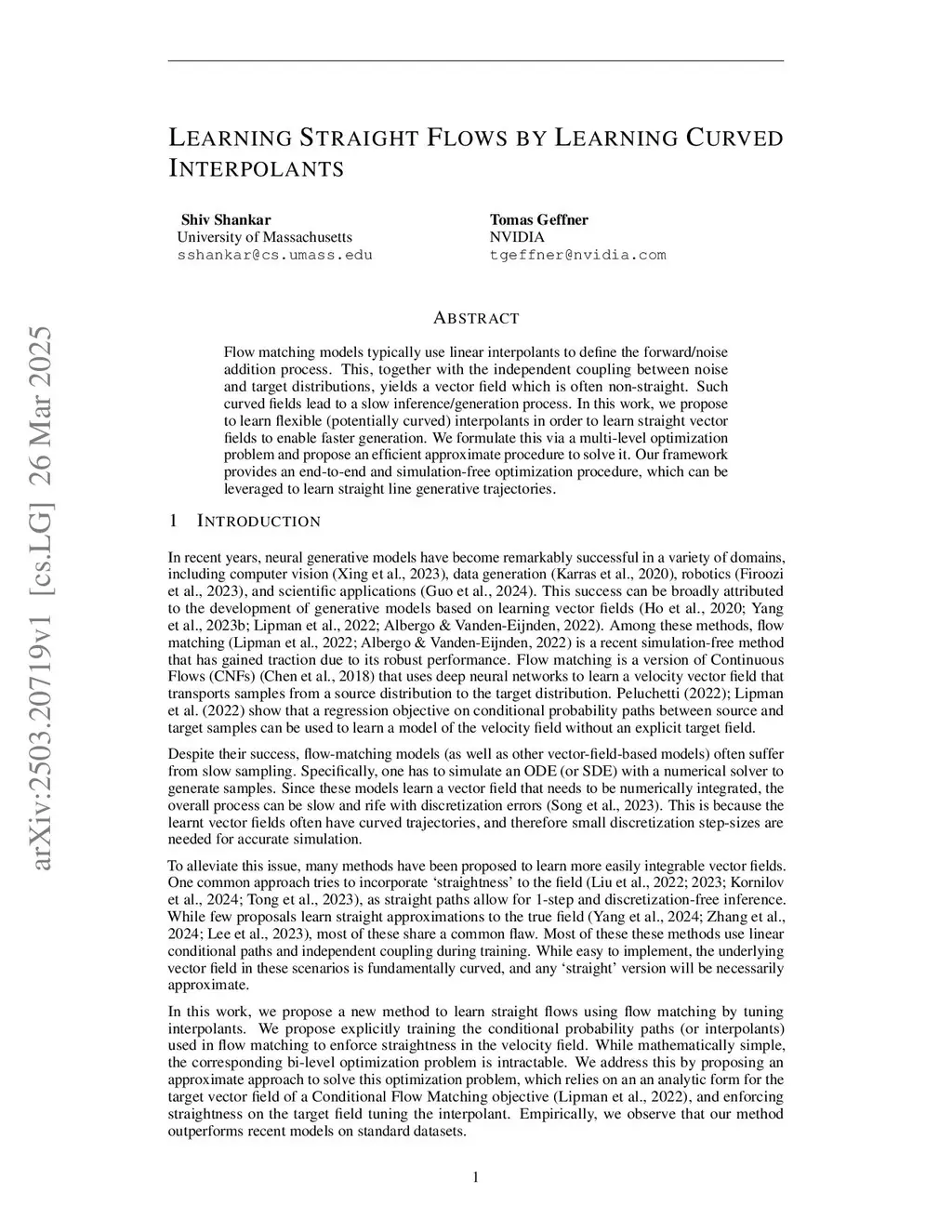 Flow matching models typically use linear interpolants to define the forward/noise addition process. This, together with the independent coupling between noise and target distributions, yields a vector field which is often non-straight. Such curved fields lead to a slow inference/generation process. In this work, we propose to learn flexible (potentially curved) interpolants in order to learn straight vector fields to enable faster generation. We formulate this via a multi-level optimization problem and propose an efficient approximate procedure to solve it. Our framework provides an end-to-end and simulation-free optimization procedure, which can be leveraged to learn straight line generative trajectories.