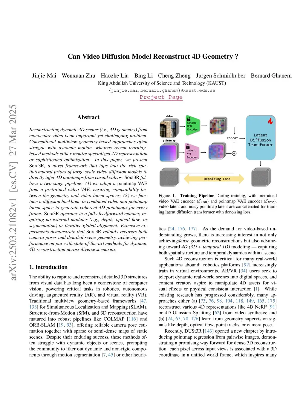 Reconstructing dynamic 3D scenes (i.e., 4D geometry) from monocular video is an important yet challenging problem. Conventional multiview geometry-based approaches often struggle with dynamic motion, whereas recent learning-based methods either require specialized 4D representation or sophisticated optimization. In this paper, we present Sora3R, a novel framework that taps into the rich spatiotemporal priors of large-scale video diffusion models to directly infer 4D pointmaps from casual videos. Sora3R follows a two-stage pipeline: (1) we adapt a pointmap VAE from a pretrained video VAE, ensuring compatibility between the geometry and video latent spaces; (2) we finetune a diffusion backbone in combined video and pointmap latent space to generate coherent 4D pointmaps for every frame. Sora3R operates in a fully feedforward manner, requiring no external modules (e.g., depth, optical flow, or segmentation) or iterative global alignment. Extensive experiments demonstrate that Sora3R reliably recovers both camera poses and detailed scene geometry, achieving performance on par with state-of-the-art methods for dynamic 4D reconstruction across diverse scenarios.