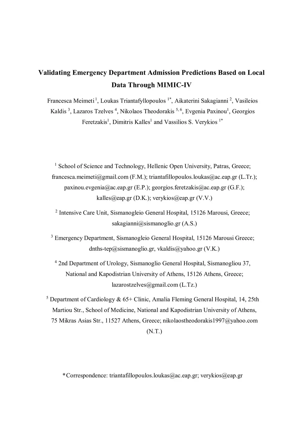 The effective management of Emergency Department (ED) overcrowding is essential for improving patient outcomes and optimizing healthcare resource allocation. This study validates hospital admission prediction models initially developed using a small local dataset from a Greek hospital by leveraging the comprehensive MIMIC-IV dataset. After preprocessing the MIMIC-IV data, five algorithms were evaluated: Linear Discriminant Analysis (LDA), K-Nearest Neighbors (KNN), Random Forest (RF), Recursive Partitioning and Regression Trees (RPART), and Support Vector Machines (SVM Radial). Among these, RF demonstrated superior performance, achieving an Area Under the Receiver Operating Characteristic Curve (AUC-ROC) of 0.9999, sensitivity of 0.9997, and specificity of 0.9999 when applied to the MIMIC-IV data. These findings highlight the robustness of RF in handling complex datasets for admission prediction, establish MIMIC-IV as a valuable benchmark for validating models based on smaller local datasets, and provide actionable insights for improving ED management strategies.
