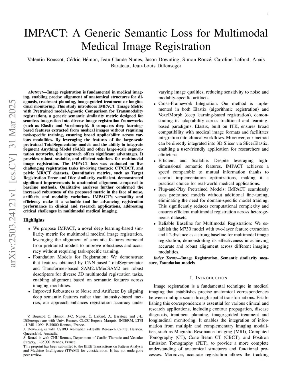 Image registration is fundamental in medical imaging, enabling precise alignment of anatomical structures for diagnosis, treatment planning, image-guided interventions, and longitudinal monitoring. This work introduces IMPACT (Image Metric with Pretrained model-Agnostic Comparison for Transmodality registration), a novel similarity metric designed for robust multimodal image registration. Rather than relying on raw intensities, handcrafted descriptors, or task-specific training, IMPACT defines a semantic similarity measure based on the comparison of deep features extracted from large-scale pretrained segmentation models. By leveraging representations from models such as TotalSegmentator, Segment Anything (SAM), and other foundation networks, IMPACT provides a task-agnostic, training-free solution that generalizes across imaging modalities. These features, originally trained for segmentation, offer strong spatial correspondence and semantic alignment capabilities, making them naturally suited for registration. The method integrates seamlessly into both algorithmic (Elastix) and learning-based (VoxelMorph) frameworks, leveraging the strengths of each. IMPACT was evaluated on five challenging 3D registration tasks involving thoracic CT/CBCT and pelvic MR/CT datasets. Quantitative metrics, including Target Registration Error and Dice Similarity Coefficient, demonstrated consistent improvements in anatomical alignment over baseline methods. Qualitative analyses further highlighted the robustness of the proposed metric in the presence of noise, artifacts, and modality variations. With its versatility, efficiency, and strong performance across diverse tasks, IMPACT offers a powerful solution for advancing multimodal image registration in both clinical and research settings.