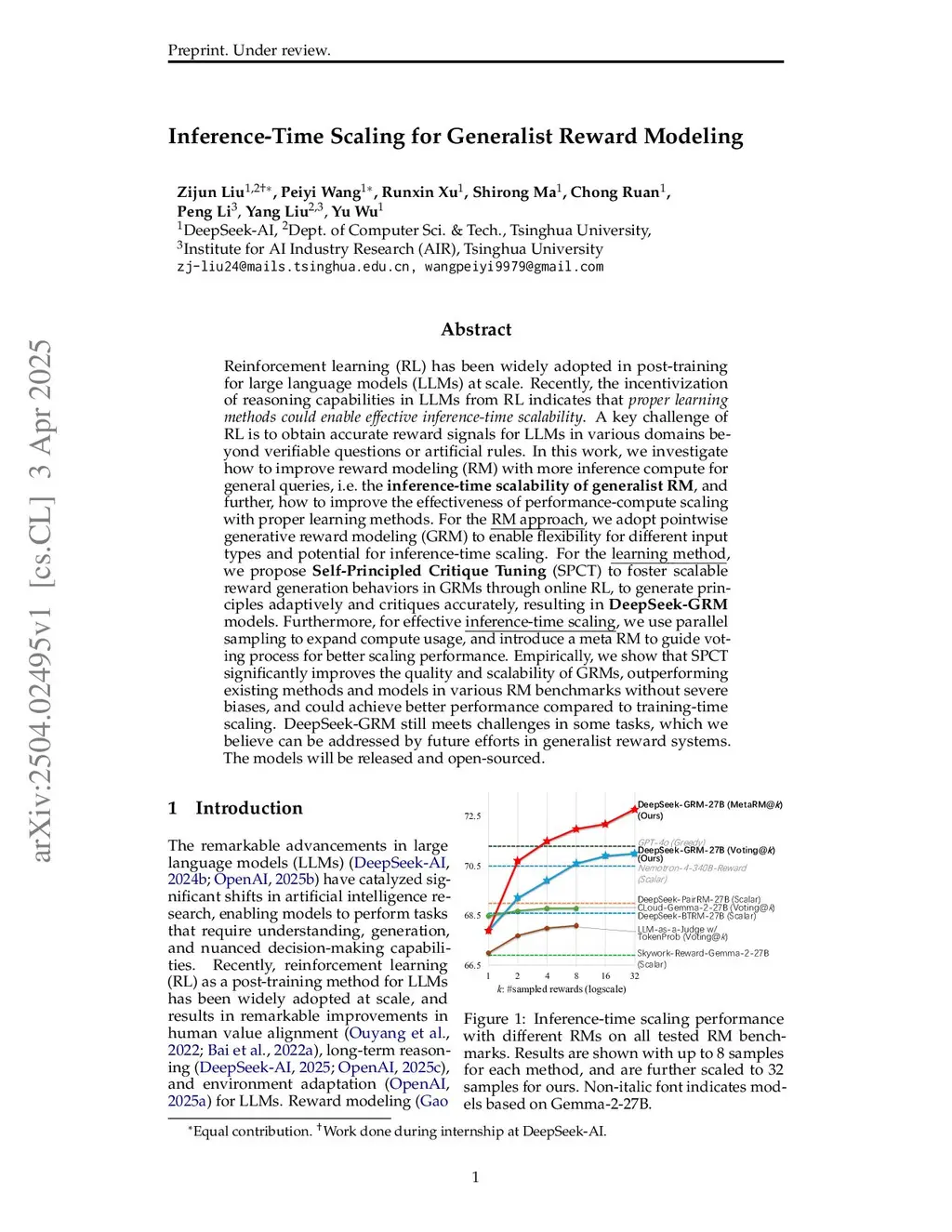 Reinforcement learning (RL) has been widely adopted in post-training for large language models (LLMs) at scale. Recently, the incentivization of reasoning capabilities in LLMs from RL indicates that . A key challenge of RL is to obtain accurate reward signals for LLMs in various domains beyond verifiable questions or artificial rules. In this work, we investigate how to improve reward modeling (RM) with more inference compute for general queries, i.e. the , and further, how to improve the effectiveness of performance-compute scaling with proper learning methods. For the RM approach, we adopt pointwise generative reward modeling (GRM) to enable flexibility for different input types and potential for inference-time scaling. For the learning method, we propose Self-Principled Critique Tuning (SPCT) to foster scalable reward generation behaviors in GRMs through online RL, to generate principles adaptively and critiques accurately, resulting in models. Furthermore, for effective inference-time scaling, we use parallel sampling to expand compute usage, and introduce a meta RM to guide voting process for better scaling performance. Empirically, we show that SPCT significantly improves the quality and scalability of GRMs, outperforming existing methods and models in various RM benchmarks without severe biases, and could achieve better performance compared to training-time scaling. DeepSeek-GRM still meets challenges in some tasks, which we believe can be addressed by future efforts in generalist reward systems. The models are released at Hugging Face and ModelScope.
