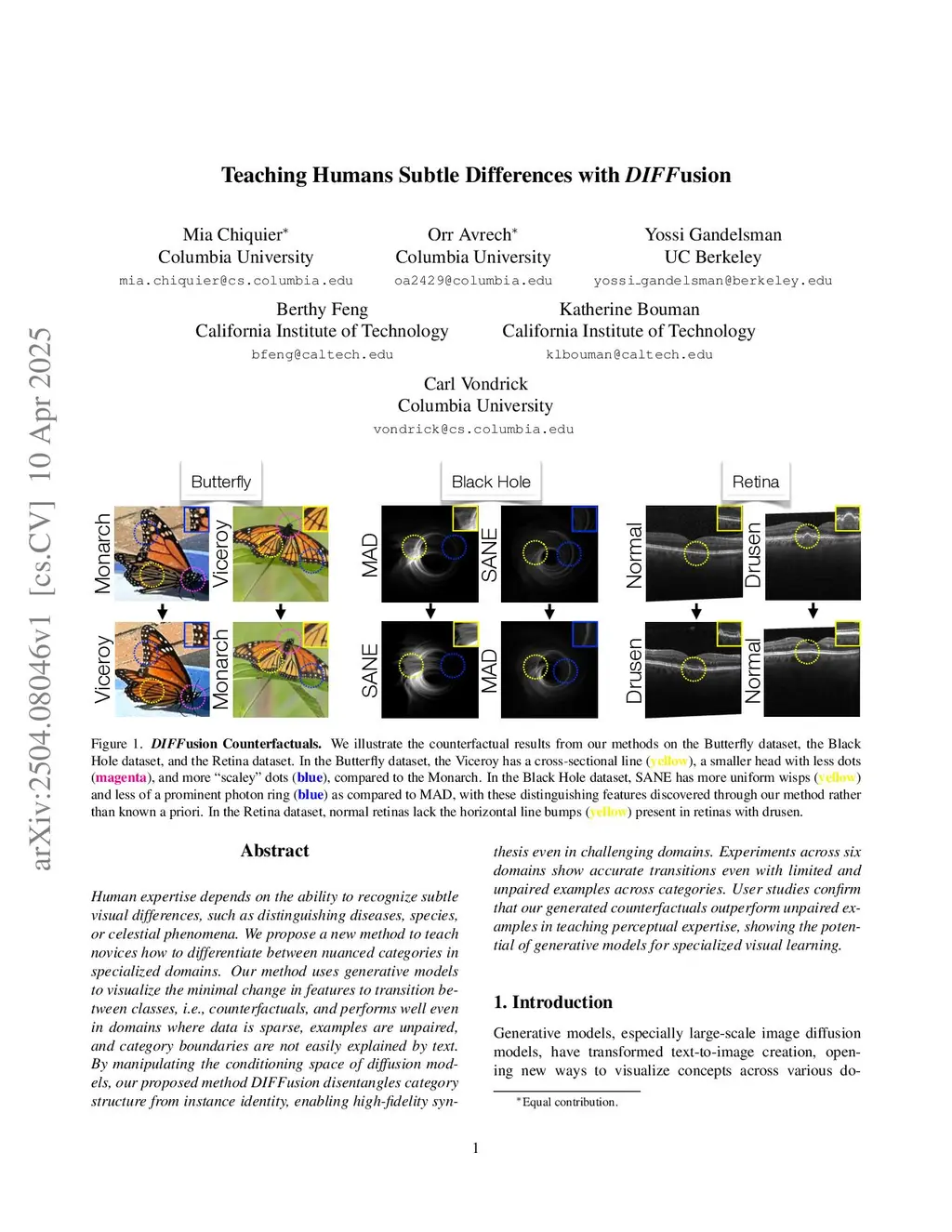 Scientific expertise often requires recognizing subtle visual differences that remain challenging to articulate even for domain experts. We present a system that leverages generative models to automatically discover and visualize minimal discriminative features between categories while preserving instance identity. Our method generates counterfactual visualizations with subtle, targeted transformations between classes, performing well even in domains where data is sparse, examples are unpaired, and category boundaries resist verbal description. Experiments across six domains, including black hole simulations, butterfly taxonomy, and medical imaging, demonstrate accurate transitions with limited training data, highlighting both established discriminative features and novel subtle distinctions that measurably improved category differentiation. User studies confirm our generated counterfactuals significantly outperform traditional approaches in teaching humans to correctly differentiate between fine-grained classes, showing the potential of generative models to advance visual learning and scientific research.