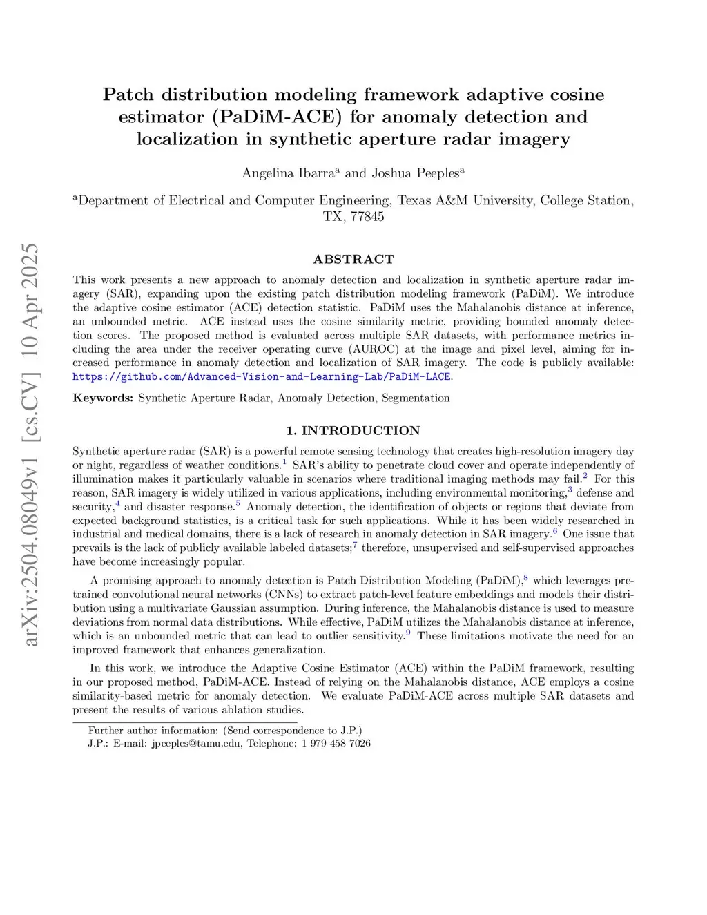 Patch distribution modeling framework adaptive cosine estimator (PaDiM-ACE) for anomaly detection and localization in synthetic aperture radar imagery