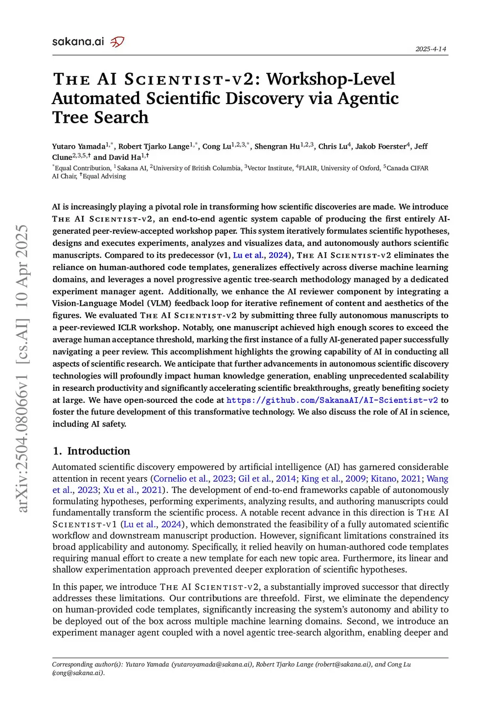 AI is increasingly playing a pivotal role in transforming how scientific discoveries are made. We introduce The AI Scientist-v2, an end-to-end agentic system capable of producing the first entirely AI generated peer-review-accepted workshop paper. This system iteratively formulates scientific hypotheses, designs and executes experiments, analyzes and visualizes data, and autonomously authors scientific manuscripts. Compared to its predecessor (v1, Lu et al., 2024arXiv:2408.06292), The AI Scientist-v2 eliminates the reliance on human-authored code templates, generalizes effectively across diverse machine learning domains, and leverages a novel progressive agentic tree-search methodology managed by a dedicated experiment manager agent. Additionally, we enhance the AI reviewer component by integrating a Vision-Language Model (VLM) feedback loop for iterative refinement of content and aesthetics of the figures. We evaluated The AI Scientist-v2 by submitting three fully autonomous manuscripts to a peer-reviewed ICLR workshop. Notably, one manuscript achieved high enough scores to exceed the average human acceptance threshold, marking the first instance of a fully AI-generated paper successfully navigating a peer review. This accomplishment highlights the growing capability of AI in conducting all aspects of scientific research. We anticipate that further advancements in autonomous scientific discovery technologies will profoundly impact human knowledge generation, enabling unprecedented scalability in research productivity and significantly accelerating scientific breakthroughs, greatly benefiting society at large. We have open-sourced the code atthis https URLto foster the future development of this transformative technology. We also discuss the role of AI in science, including AI safety.