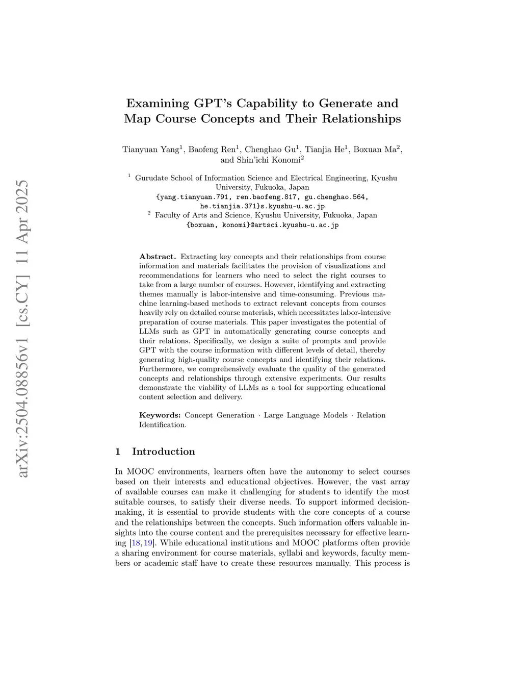 Extracting key concepts and their relationships from course information and materials facilitates the provision of visualizations and recommendations for learners who need to select the right courses to take from a large number of courses. However, identifying and extracting themes manually is labor-intensive and time-consuming. Previous machine learning-based methods to extract relevant concepts from courses heavily rely on detailed course materials, which necessitates labor-intensive preparation of course materials. This paper investigates the potential of LLMs such as GPT in automatically generating course concepts and their relations. Specifically, we design a suite of prompts and provide GPT with the course information with different levels of detail, thereby generating high-quality course concepts and identifying their relations. Furthermore, we comprehensively evaluate the quality of the generated concepts and relationships through extensive experiments. Our results demonstrate the viability of LLMs as a tool for supporting educational content selection and delivery.