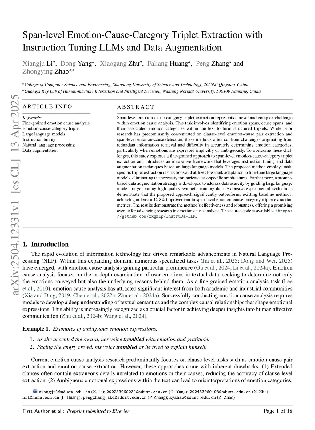 Span-level emotion-cause-category triplet extraction represents a novel and complex challenge within emotion cause analysis. This task involves identifying emotion spans, cause spans, and their associated emotion categories within the text to form structured triplets. While prior research has predominantly concentrated on clause-level emotion-cause pair extraction and span-level emotion-cause detection, these methods often confront challenges originating from redundant information retrieval and difficulty in accurately determining emotion categories, particularly when emotions are expressed implicitly or ambiguously. To overcome these challenges, this study explores a fine-grained approach to span-level emotion-cause-category triplet extraction and introduces an innovative framework that leverages instruction tuning and data augmentation techniques based on large language models. The proposed method employs task-specific triplet extraction instructions and utilizes low-rank adaptation to fine-tune large language models, eliminating the necessity for intricate task-specific architectures. Furthermore, a prompt-based data augmentation strategy is developed to address data scarcity by guiding large language models in generating high-quality synthetic training data. Extensive experimental evaluations demonstrate that the proposed approach significantly outperforms existing baseline methods, achieving at least a 12.8% improvement in span-level emotion-cause-category triplet extraction metrics. The results demonstrate the method's effectiveness and robustness, offering a promising avenue for advancing research in emotion cause analysis. The source code is available atthis https URL.