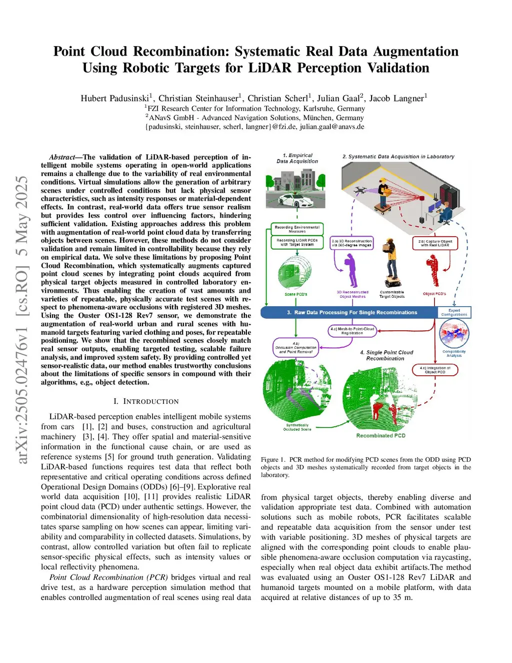 The validation of LiDAR-based perception of intelligent mobile systems operating in open-world applications remains a challenge due to the variability of real environmental conditions. Virtual simulations allow the generation of arbitrary scenes under controlled conditions but lack physical sensor characteristics, such as intensity responses or material-dependent effects. In contrast, real-world data offers true sensor realism but provides less control over influencing factors, hindering sufficient validation. Existing approaches address this problem with augmentation of real-world point cloud data by transferring objects between scenes. However, these methods do not consider validation and remain limited in controllability because they rely on empirical data. We solve these limitations by proposing Point Cloud Recombination, which systematically augments captured point cloud scenes by integrating point clouds acquired from physical target objects measured in controlled laboratory environments. Thus enabling the creation of vast amounts and varieties of repeatable, physically accurate test scenes with respect to phenomena-aware occlusions with registered 3D meshes. Using the Ouster OS1-128 Rev7 sensor, we demonstrate the augmentation of real-world urban and rural scenes with humanoid targets featuring varied clothing and poses, for repeatable positioning. We show that the recombined scenes closely match real sensor outputs, enabling targeted testing, scalable failure analysis, and improved system safety. By providing controlled yet sensor-realistic data, our method enables trustworthy conclusions about the limitations of specific sensors in compound with their algorithms, e.g., object detection.