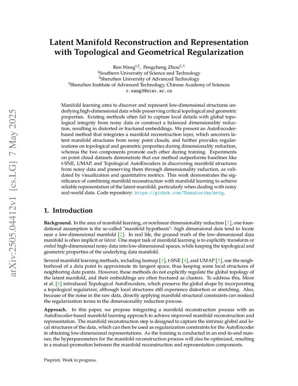 Latent Manifold Reconstruction and Representation with Topological and Geometrical Regularization