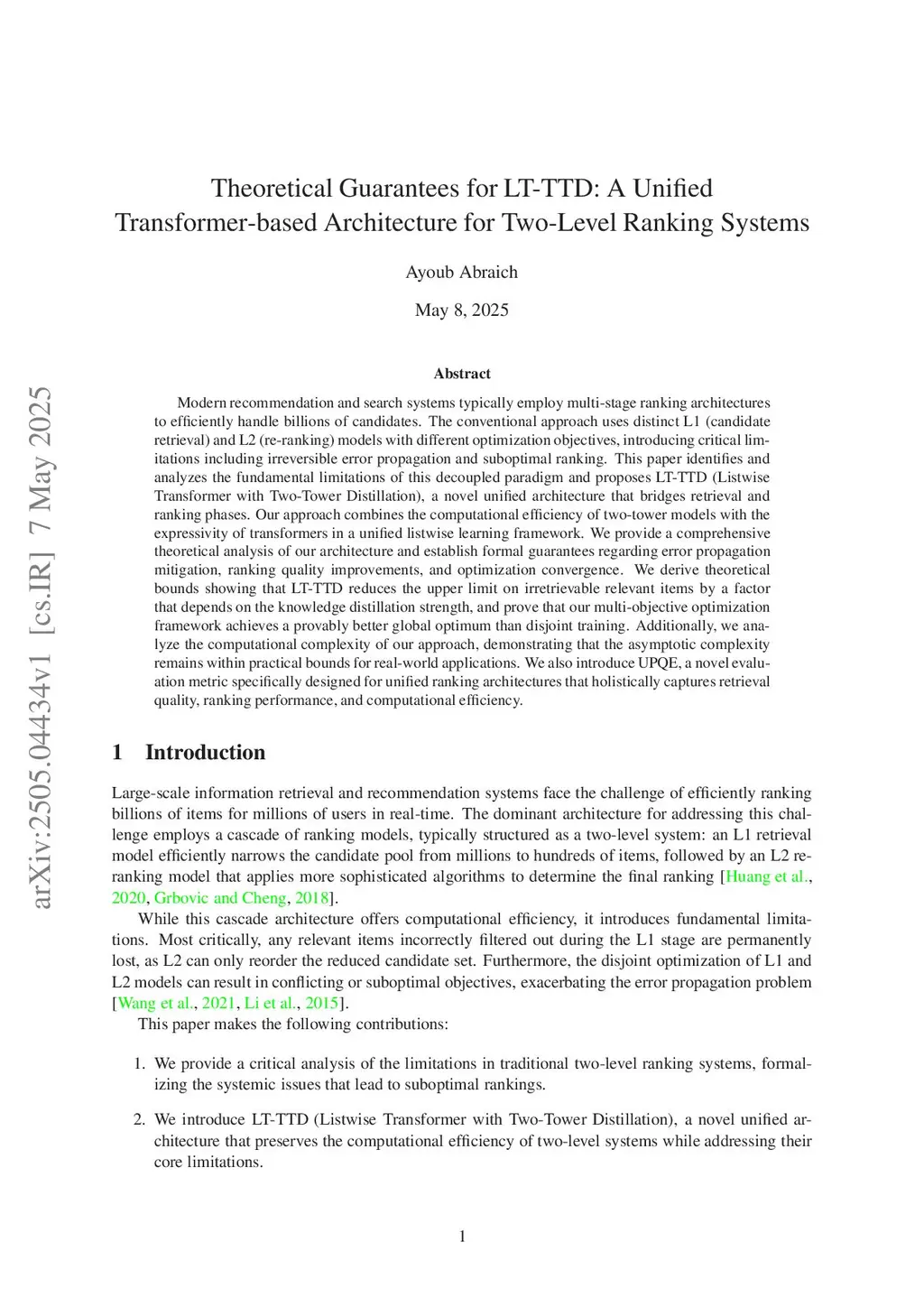 Modern recommendation and search systems typically employ multi-stage ranking architectures to efficiently handle billions of candidates. The conventional approach uses distinct L1 (candidate retrieval) and L2 (re-ranking) models with different optimization objectives, introducing critical limitations including irreversible error propagation and suboptimal ranking. This paper identifies and analyzes the fundamental limitations of this decoupled paradigm and proposes LT-TTD (Listwise Transformer with Two-Tower Distillation), a novel unified architecture that bridges retrieval and ranking phases. Our approach combines the computational efficiency of two-tower models with the expressivity of transformers in a unified listwise learning framework. We provide a comprehensive theoretical analysis of our architecture and establish formal guarantees regarding error propagation mitigation, ranking quality improvements, and optimization convergence. We derive theoretical bounds showing that LT-TTD reduces the upper limit on irretrievable relevant items by a factor that depends on the knowledge distillation strength, and prove that our multi-objective optimization framework achieves a provably better global optimum than disjoint training. Additionally, we analyze the computational complexity of our approach, demonstrating that the asymptotic complexity remains within practical bounds for real-world applications. We also introduce UPQE, a novel evaluation metric specifically designed for unified ranking architectures that holistically captures retrieval quality, ranking performance, and computational efficiency.
