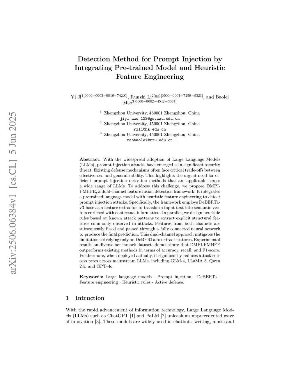 With the widespread adoption of Large Language Models (LLMs), prompt injection attacks have emerged as a significant security threat. Existing defense mechanisms often face critical trade-offs between effectiveness and generalizability. This highlights the urgent need for efficient prompt injection detection methods that are applicable across a wide range of LLMs. To address this challenge, we propose DMPI-PMHFE, a dual-channel feature fusion detection framework. It integrates a pretrained language model with heuristic feature engineering to detect prompt injection attacks. Specifically, the framework employs DeBERTa-v3-base as a feature extractor to transform input text into semantic vectors enriched with contextual information. In parallel, we design heuristic rules based on known attack patterns to extract explicit structural features commonly observed in attacks. Features from both channels are subsequently fused and passed through a fully connected neural network to produce the final prediction. This dual-channel approach mitigates the limitations of relying only on DeBERTa to extract features. Experimental results on diverse benchmark datasets demonstrate that DMPI-PMHFE outperforms existing methods in terms of accuracy, recall, and F1-score. Furthermore, when deployed actually, it significantly reduces attack success rates across mainstream LLMs, including GLM-4, LLaMA 3, Qwen 2.5, and GPT-4o.