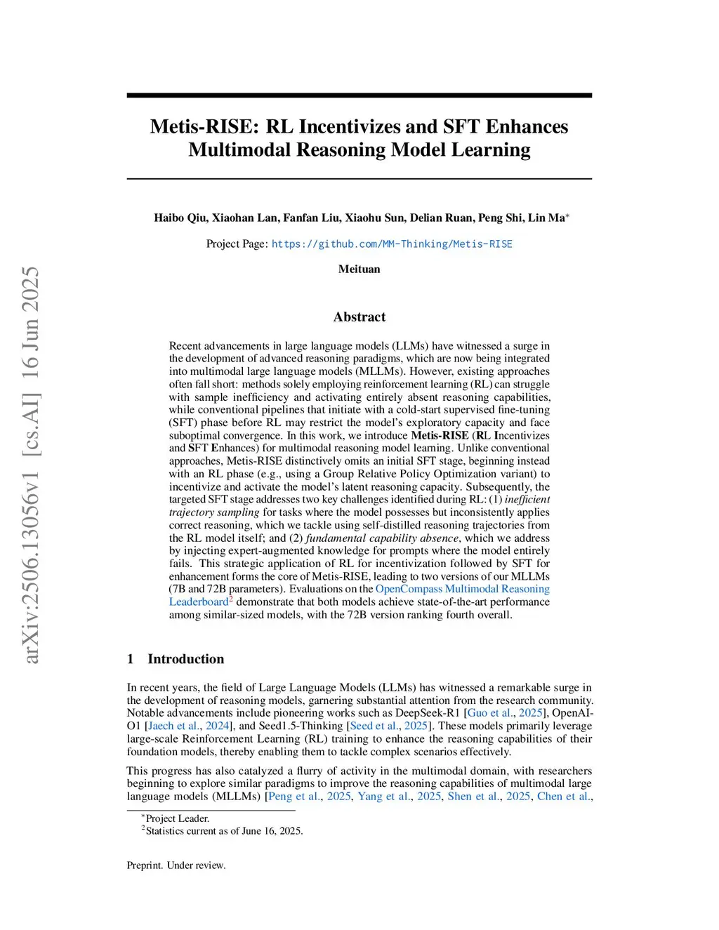 Recent advancements in large language models (LLMs) have witnessed a surge in the development of advanced reasoning paradigms, which are now being integrated into multimodal large language models (MLLMs). However, existing approaches often fall short: methods solely employing reinforcement learning (RL) can struggle with sample inefficiency and activating entirely absent reasoning capabilities, while conventional pipelines that initiate with a cold-start supervised fine-tuning (SFT) phase before RL may restrict the model's exploratory capacity and face suboptimal convergence. In this work, we introduce \textbf{Metis-RISE} (\textbf{R}L \textbf{I}ncentivizes and \textbf{S}FT \textbf{E}nhances) for multimodal reasoning model learning. Unlike conventional approaches, Metis-RISE distinctively omits an initial SFT stage, beginning instead with an RL phase (e.g., using a Group Relative Policy Optimization variant) to incentivize and activate the model's latent reasoning capacity. Subsequently, the targeted SFT stage addresses two key challenges identified during RL: (1) \textit{inefficient trajectory sampling} for tasks where the model possesses but inconsistently applies correct reasoning, which we tackle using self-distilled reasoning trajectories from the RL model itself; and (2) \textit{fundamental capability absence}, which we address by injecting expert-augmented knowledge for prompts where the model entirely fails. This strategic application of RL for incentivization followed by SFT for enhancement forms the core of Metis-RISE, leading to two versions of our MLLMs (7B and 72B parameters). Evaluations on the OpenCompass Multimodal Reasoning Leaderboard demonstrate that both models achieve state-of-the-art performance among similar-sized models, with the 72B version ranking fourth overall. Please refer to our project page for open-source information.