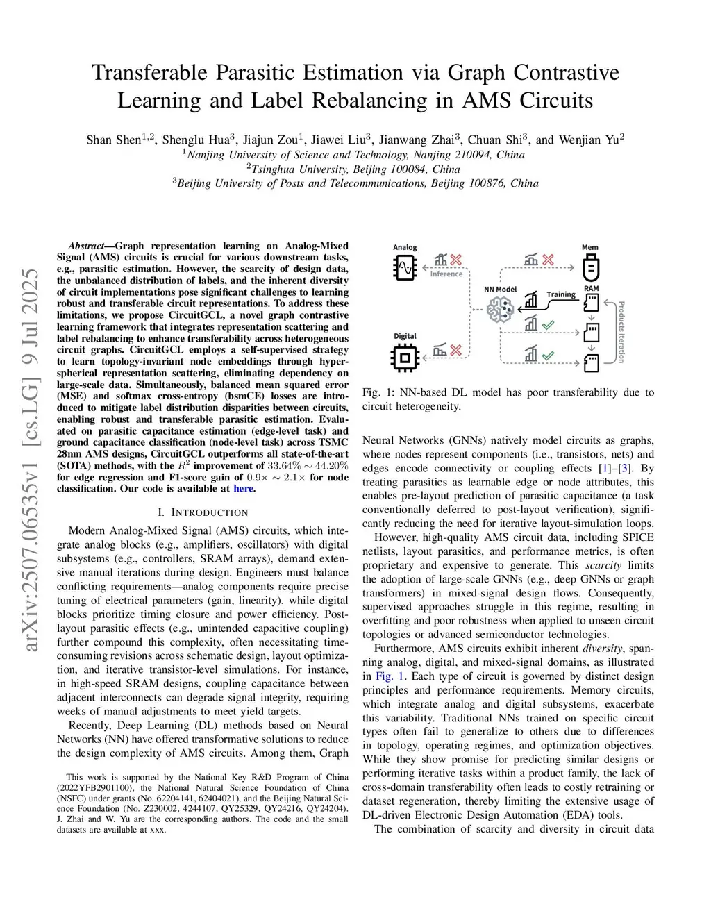 Graph representation learning on Analog-Mixed Signal (AMS) circuits is crucial for various downstream tasks, e.g., parasitic estimation. However, the scarcity of design data, the unbalanced distribution of labels, and the inherent diversity of circuit implementations pose significant challenges to learning robust and transferable circuit representations. To address these limitations, we propose CircuitGCL, a novel graph contrastive learning framework that integrates representation scattering and label rebalancing to enhance transferability across heterogeneous circuit graphs. CircuitGCL employs a self-supervised strategy to learn topology-invariant node embeddings through hyperspherical representation scattering, eliminating dependency on large-scale data. Simultaneously, balanced mean squared error (BMSE) and balanced softmax cross-entropy (BSCE) losses are introduced to mitigate label distribution disparities between circuits, enabling robust and transferable parasitic estimation. Evaluated on parasitic capacitance estimation (edge-level task) and ground capacitance classification (node-level task) across TSMC 28nm AMS designs, CircuitGCL outperforms all state-of-the-art (SOTA) methods, with the improvement of for edge regression and F1-score gain of for node classification. Our code is available atthis https URL.