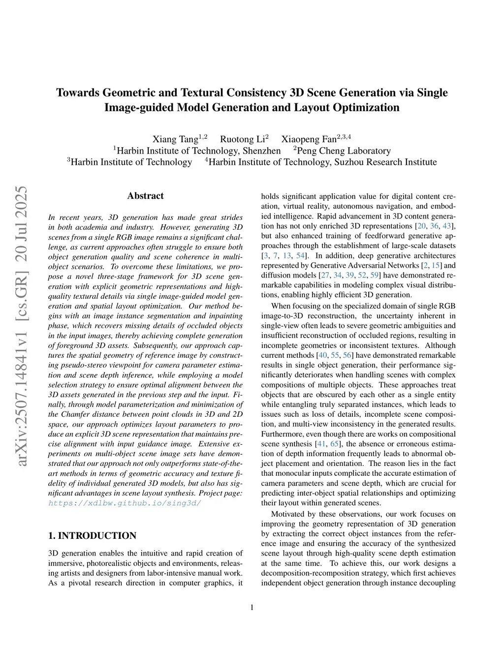 In recent years, 3D generation has made great strides in both academia and industry. However, generating 3D scenes from a single RGB image remains a significant challenge, as current approaches often struggle to ensure both object generation quality and scene coherence in multi-object scenarios. To overcome these limitations, we propose a novel three-stage framework for 3D scene generation with explicit geometric representations and high-quality textural details via single image-guided model generation and spatial layout optimization. Our method begins with an image instance segmentation and inpainting phase, which recovers missing details of occluded objects in the input images, thereby achieving complete generation of foreground 3D assets. Subsequently, our approach captures the spatial geometry of reference image by constructing pseudo-stereo viewpoint for camera parameter estimation and scene depth inference, while employing a model selection strategy to ensure optimal alignment between the 3D assets generated in the previous step and the input. Finally, through model parameterization and minimization of the Chamfer distance between point clouds in 3D and 2D space, our approach optimizes layout parameters to produce an explicit 3D scene representation that maintains precise alignment with input guidance image. Extensive experiments on multi-object scene image sets have demonstrated that our approach not only outperforms state-of-the-art methods in terms of geometric accuracy and texture fidelity of individual generated 3D models, but also has significant advantages in scene layout synthesis.