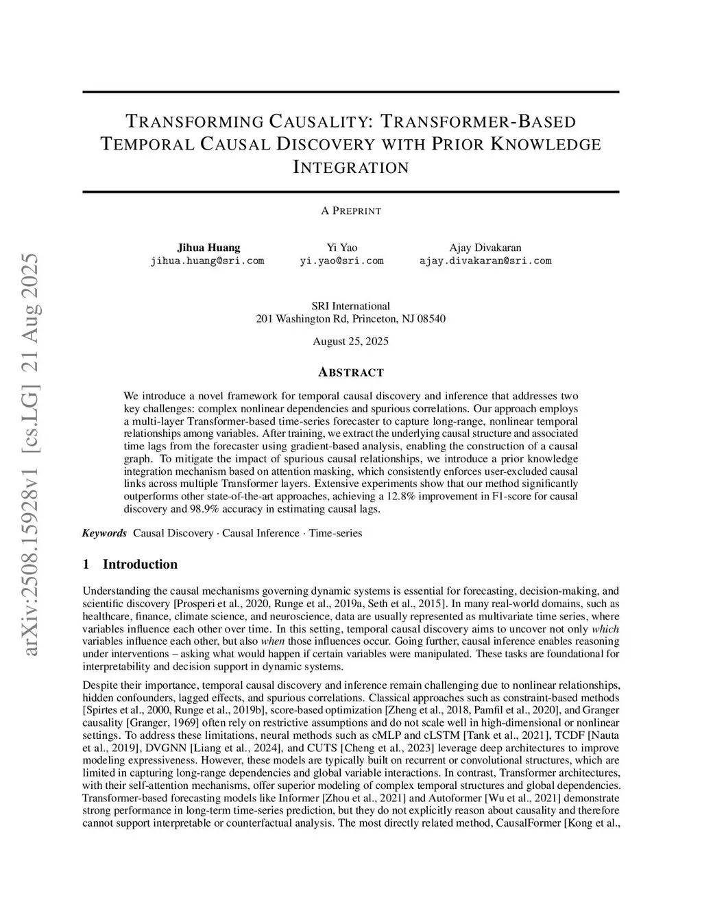 We introduce a novel framework for temporal causal discovery and inference that addresses two key challenges: complex nonlinear dependencies and spurious correlations. Our approach employs a multi-layer Transformer-based time-series forecaster to capture long-range, nonlinear temporal relationships among variables. After training, we extract the underlying causal structure and associated time lags from the forecaster using gradient-based analysis, enabling the construction of a causal graph. To mitigate the impact of spurious causal relationships, we introduce a prior knowledge integration mechanism based on attention masking, which consistently enforces user-excluded causal links across multiple Transformer layers. Extensive experiments show that our method significantly outperforms other state-of-the-art approaches, achieving a 12.8% improvement in F1-score for causal discovery and 98.9% accuracy in estimating causal lags.