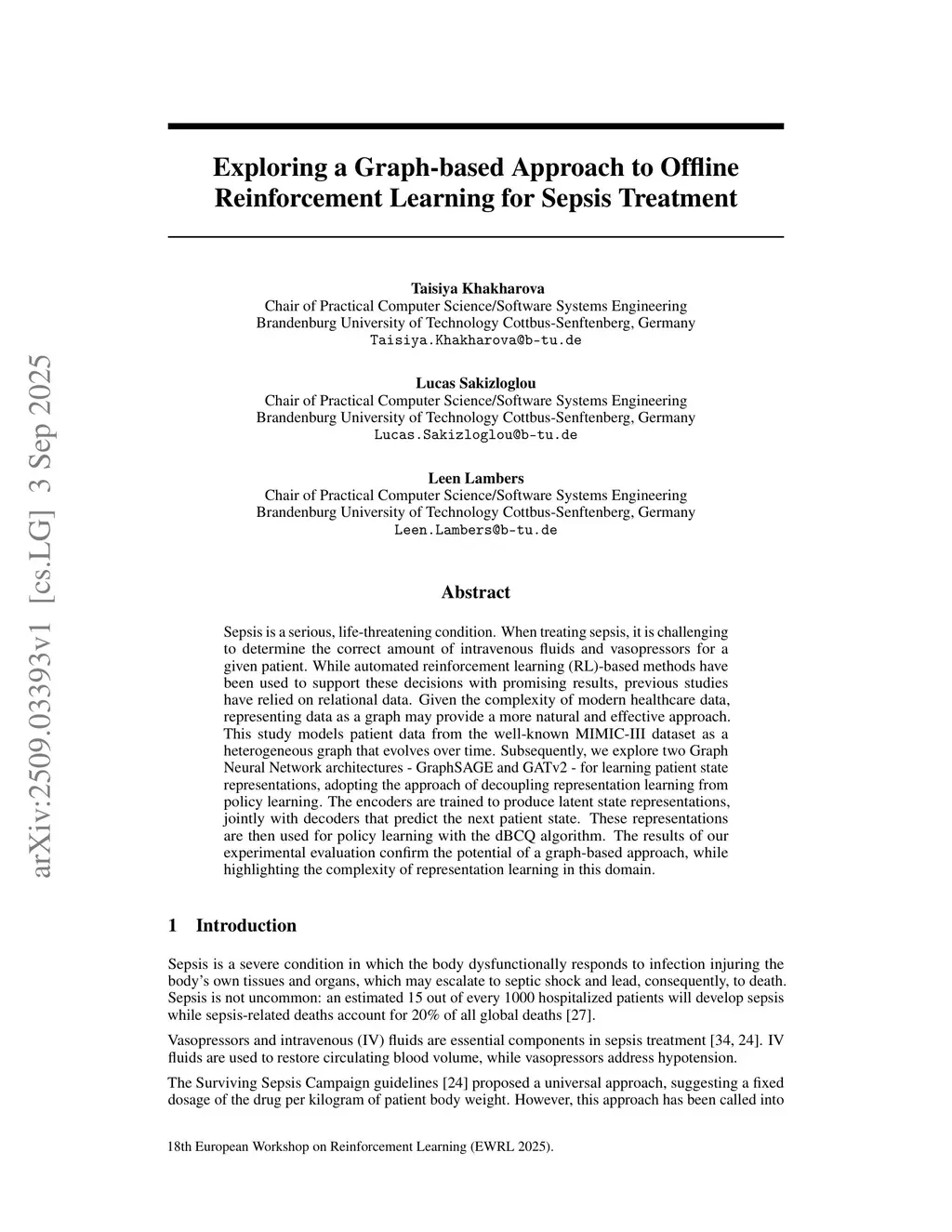 Sepsis is a serious, life-threatening condition. When treating sepsis, it is challenging to determine the correct amount of intravenous fluids and vasopressors for a given patient. While automated reinforcement learning (RL)-based methods have been used to support these decisions with promising results, previous studies have relied on relational data. Given the complexity of modern healthcare data, representing data as a graph may provide a more natural and effective approach. This study models patient data from the well-known MIMIC-III dataset as a heterogeneous graph that evolves over time. Subsequently, we explore two Graph Neural Network architectures - GraphSAGE and GATv2 - for learning patient state representations, adopting the approach of decoupling representation learning from policy learning. The encoders are trained to produce latent state representations, jointly with decoders that predict the next patient state. These representations are then used for policy learning with the dBCQ algorithm. The results of our experimental evaluation confirm the potential of a graph-based approach, while highlighting the complexity of representation learning in this domain.