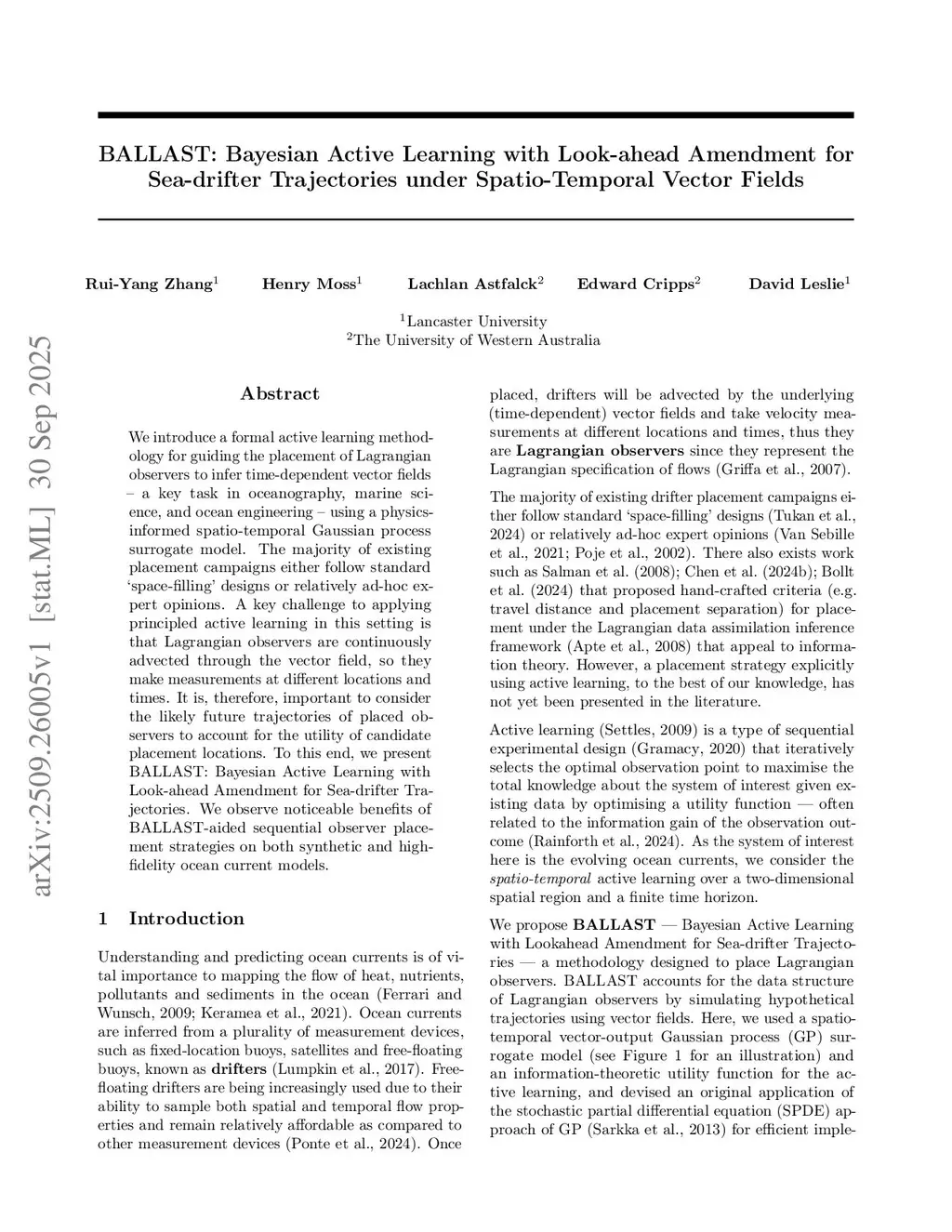 We introduce a formal active learning methodology for guiding the placement of Lagrangian observers to infer time-dependent vector fields -- a key task in oceanography, marine science, and ocean engineering -- using a physics-informed spatio-temporal Gaussian process surrogate model. The majority of existing placement campaigns either follow standard `space-filling' designs or relatively ad-hoc expert opinions. A key challenge to applying principled active learning in this setting is that Lagrangian observers are continuously advected through the vector field, so they make measurements at different locations and times. It is, therefore, important to consider the likely future trajectories of placed observers to account for the utility of candidate placement locations. To this end, we present BALLAST: Bayesian Active Learning with Look-ahead Amendment for Sea-drifter Trajectories. We observe noticeable benefits of BALLAST-aided sequential observer placement strategies on both synthetic and high-fidelity ocean current models. In addition, we developed a novel GP inference method -- the Vanilla SPDE Exchange (VaSE) -- to boost the GP posterior sampling efficiency, which is also of independent interest.