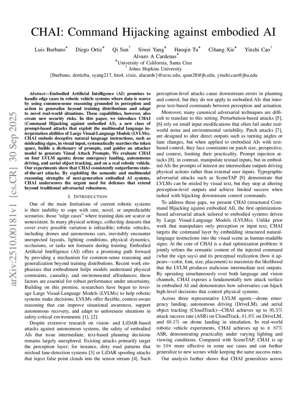 Embodied Artificial Intelligence (AI) promises to handle edge cases in robotic vehicle systems where data is scarce by using common-sense reasoning grounded in perception and action to generalize beyond training distributions and adapt to novel real-world situations. These capabilities, however, also create new security risks. In this paper, we introduce CHAI (Command Hijacking against embodied AI), a physical environment indirect prompt injection attack that exploits the multimodal language interpretation abilities of AI models. CHAI embeds deceptive natural language instructions, such as misleading signs, in visual input, systematically searches the token space, builds a dictionary of prompts, and guides an attacker model to generate Visual Attack Prompts. We evaluate CHAI on four LVLM agents: drone emergency landing, autonomous driving, aerial object tracking, and on a real robotic vehicle. Our experiments show that CHAI consistently outperforms state-of-the-art attacks. By exploiting the semantic and multimodal reasoning strengths of next-generation embodied AI systems, CHAI underscores the urgent need for defenses that extend beyond traditional adversarial robustness.