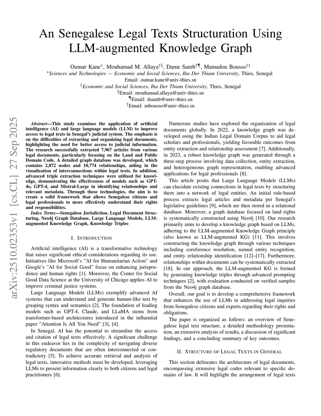 This study examines the application of artificial intelligence (AI) and large language models (LLM) to improve access to legal texts in Senegal's judicial system. The emphasis is on the difficulties of extracting and organizing legal documents, highlighting the need for better access to judicial information. The research successfully extracted 7,967 articles from various legal documents, particularly focusing on the Land and Public Domain Code. A detailed graph database was developed, which contains 2,872 nodes and 10,774 relationships, aiding in the visualization of interconnections within legal texts. In addition, advanced triple extraction techniques were utilized for knowledge, demonstrating the effectiveness of models such as GPT-4o, GPT-4, and Mistral-Large in identifying relationships and relevant metadata. Through these technologies, the aim is to create a solid framework that allows Senegalese citizens and legal professionals to more effectively understand their rights and responsibilities.