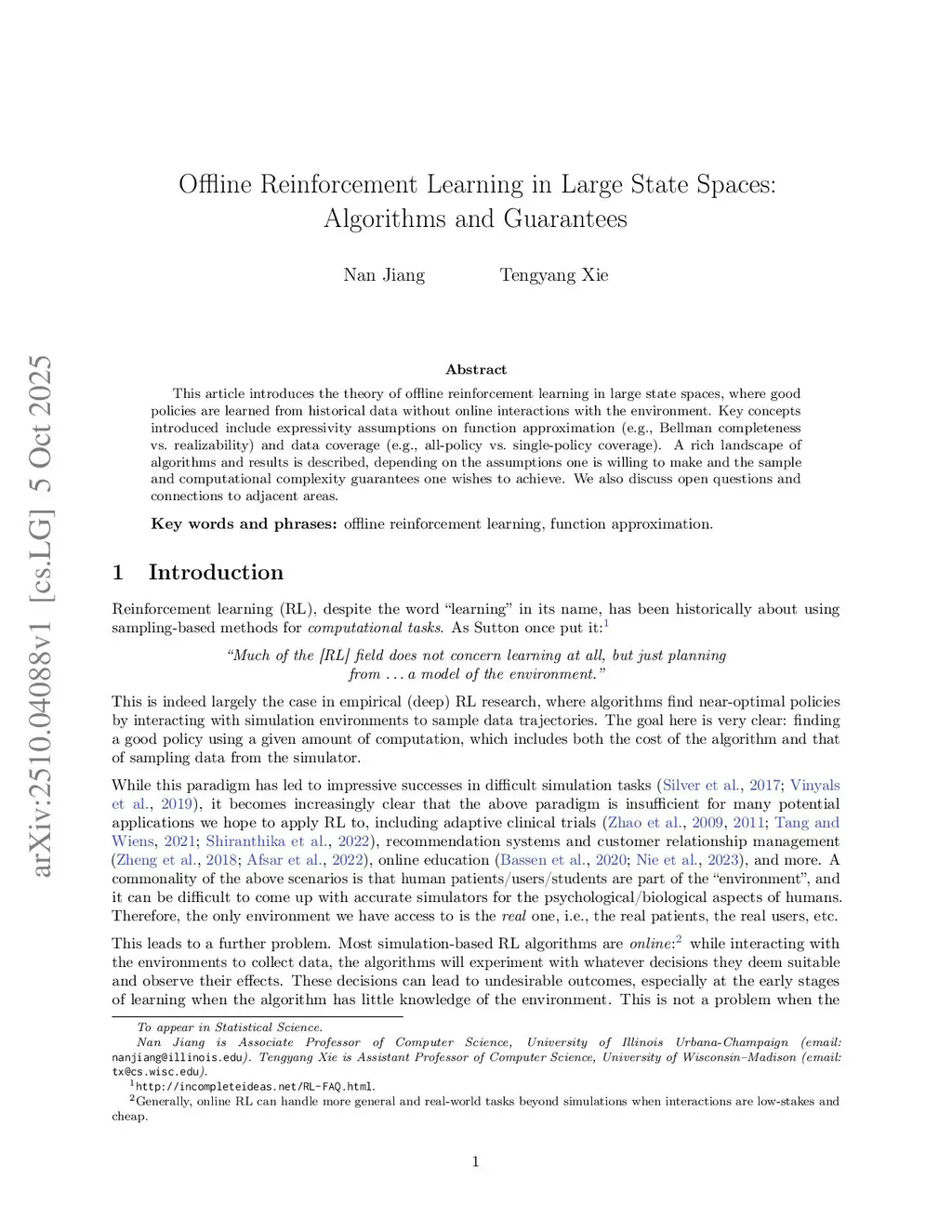 This article introduces the theory of offline reinforcement learning in large state spaces, where good policies are learned from historical data without online interactions with the environment. Key concepts introduced include expressivity assumptions on function approximation (e.g., Bellman completeness vs. realizability) and data coverage (e.g., all-policy vs. single-policy coverage). A rich landscape of algorithms and results is described, depending on the assumptions one is willing to make and the sample and computational complexity guarantees one wishes to achieve. We also discuss open questions and connections to adjacent areas.