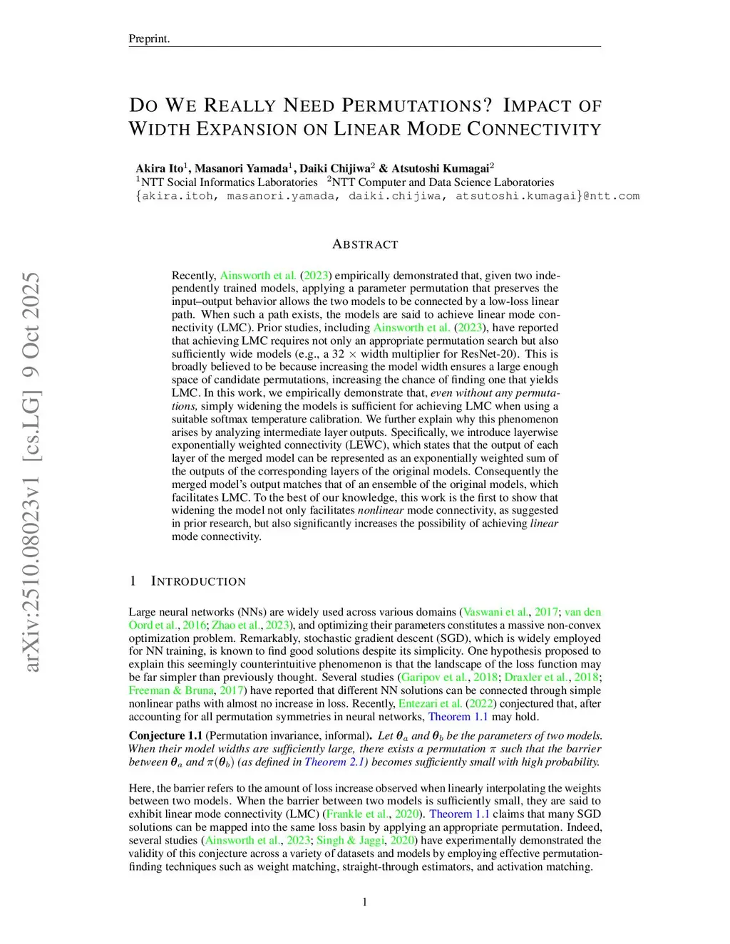 Recently, Ainsworth et al. empirically demonstrated that, given two independently trained models, applying a parameter permutation that preserves the input-output behavior allows the two models to be connected by a low-loss linear path. When such a path exists, the models are said to achieve linear mode connectivity (LMC). Prior studies, including Ainsworth et al.(2023), have reported that achieving LMC requires not only an appropriate permutation search but also sufficiently wide models (e.g., a 32 width multiplier for ResNet-20). This is broadly believed to be because increasing the model width ensures a large enough space of candidate permutations, increasing the chance of finding one that yields LMC. In this work, we empirically demonstrate that, even without any permutations, simply widening the models is sufficient for achieving LMC when using a suitable softmax temperature calibration. We further explain why this phenomenon arises by analyzing intermediate layer outputs. Specifically, we introduce layerwise exponentially weighted connectivity (LEWC), which states that the output of each layer of the merged model can be represented as an exponentially weighted sum of the outputs of the corresponding layers of the original models. Consequently the merged model's output matches that of an ensemble of the original models, facilitating LMC. To the best of our knowledge, this work is the first to show that widening the model not only facilitates nonlinear mode connectivity, as suggested in prior research, but also significantly increases the possibility of achieving linear mode connectivity.