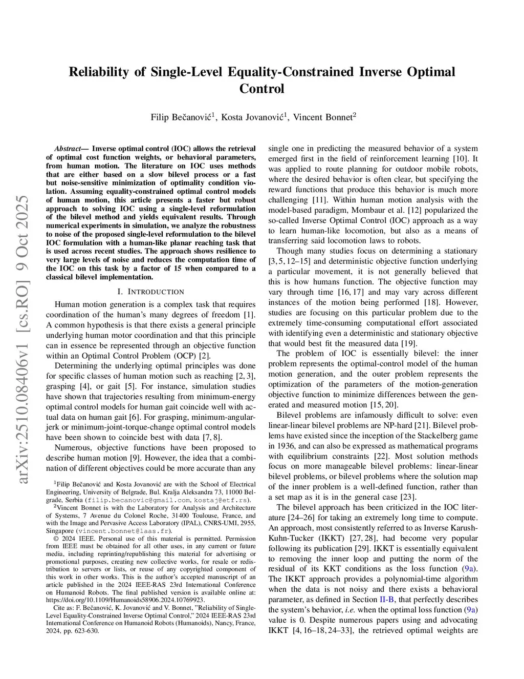 Inverse optimal control (IOC) allows the retrieval of optimal cost function weights, or behavioral parameters, from human motion. The literature on IOC uses methods that are either based on a slow bilevel process or a fast but noise-sensitive minimization of optimality condition violation. Assuming equality-constrained optimal control models of human motion, this article presents a faster but robust approach to solving IOC using a single-level reformulation of the bilevel method and yields equivalent results. Through numerical experiments in simulation, we analyze the robustness to noise of the proposed single-level reformulation to the bilevel IOC formulation with a human-like planar reaching task that is used across recent studies. The approach shows resilience to very large levels of noise and reduces the computation time of the IOC on this task by a factor of 15 when compared to a classical bilevel implementation.