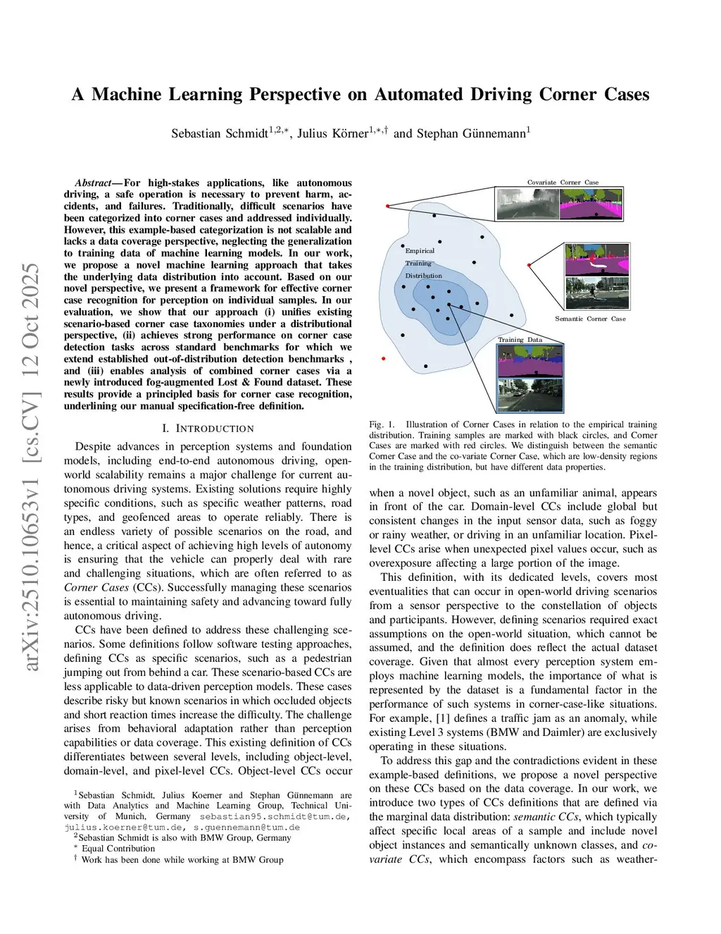 For high-stakes applications, like autonomous driving, a safe operation is necessary to prevent harm, accidents, and failures. Traditionally, difficult scenarios have been categorized into corner cases and addressed individually. However, this example-based categorization is not scalable and lacks a data coverage perspective, neglecting the generalization to training data of machine learning models. In our work, we propose a novel machine learning approach that takes the underlying data distribution into account. Based on our novel perspective, we present a framework for effective corner case recognition for perception on individual samples. In our evaluation, we show that our approach (i) unifies existing scenario-based corner case taxonomies under a distributional perspective, (ii) achieves strong performance on corner case detection tasks across standard benchmarks for which we extend established out-of-distribution detection benchmarks, and (iii) enables analysis of combined corner cases via a newly introduced fog-augmented Lost & Found dataset. These results provide a principled basis for corner case recognition, underlining our manual specification-free definition.