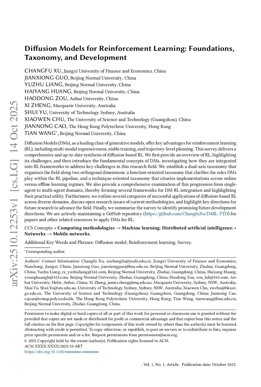 Diffusion Models for Reinforcement Learning: Foundations, Taxonomy, and Development