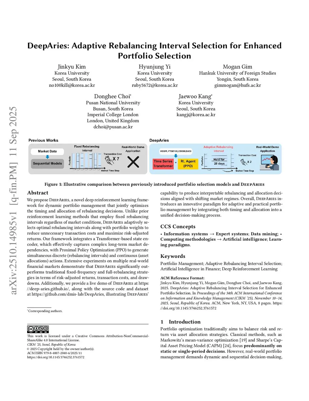 We propose DeepAries , a novel deep reinforcement learning framework for dynamic portfolio management that jointly optimizes the timing and allocation of rebalancing decisions. Unlike prior reinforcement learning methods that employ fixed rebalancing intervals regardless of market conditions, DeepAries adaptively selects optimal rebalancing intervals along with portfolio weights to reduce unnecessary transaction costs and maximize risk-adjusted returns. Our framework integrates a Transformer-based state encoder, which effectively captures complex long-term market dependencies, with Proximal Policy Optimization (PPO) to generate simultaneous discrete (rebalancing intervals) and continuous (asset allocations) actions. Extensive experiments on multiple real-world financial markets demonstrate that DeepAries significantly outperforms traditional fixed-frequency and full-rebalancing strategies in terms of risk-adjusted returns, transaction costs, and drawdowns. Additionally, we provide a live demo of DeepAries atthis https URL, along with the source code and dataset atthis https URL, illustrating DeepAries' capability to produce interpretable rebalancing and allocation decisions aligned with shifting market regimes. Overall, DeepAries introduces an innovative paradigm for adaptive and practical portfolio management by integrating both timing and allocation into a unified decision-making process.