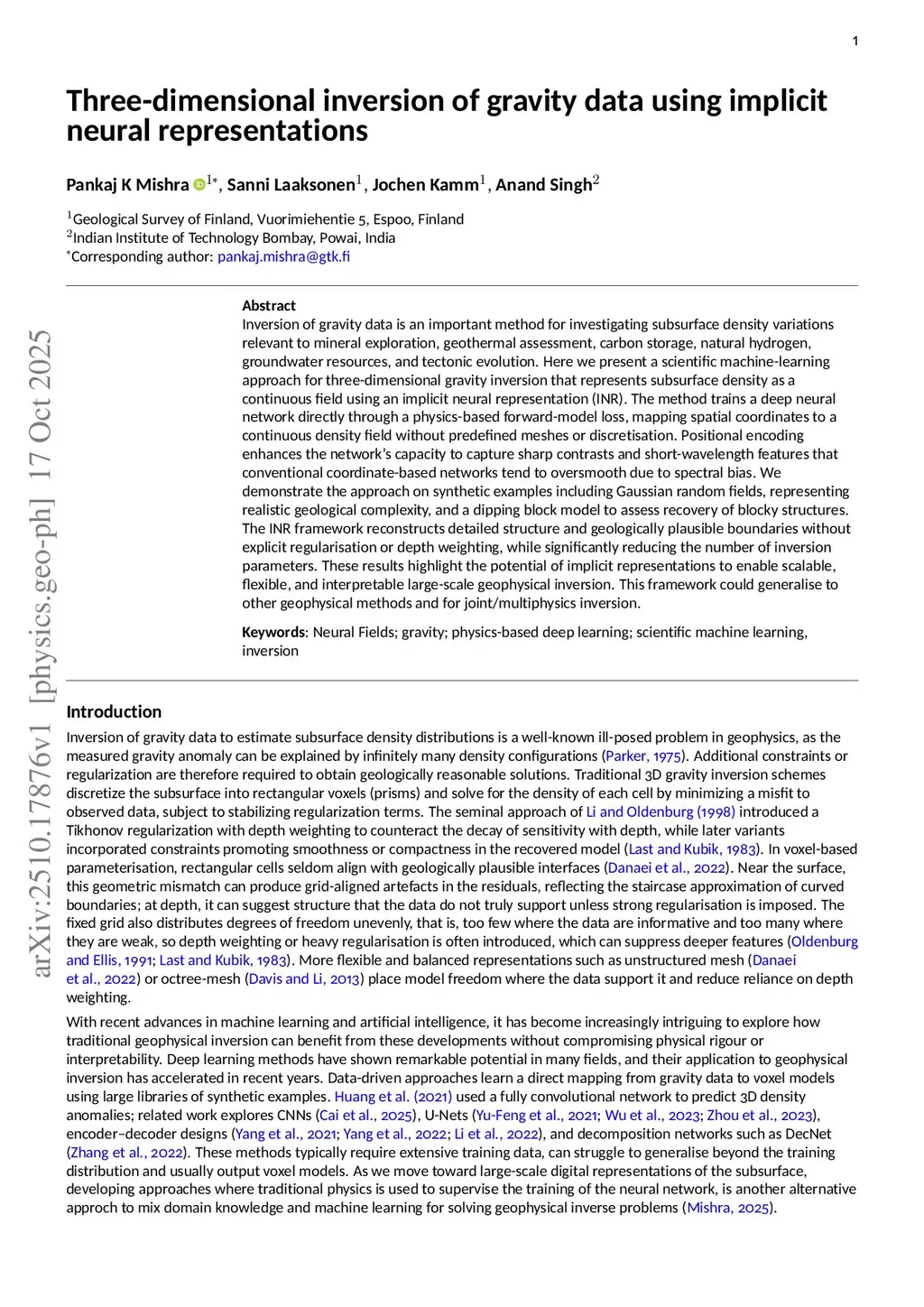 Three-dimensional inversion of gravity data using implicit neural representations and scientific machine learning