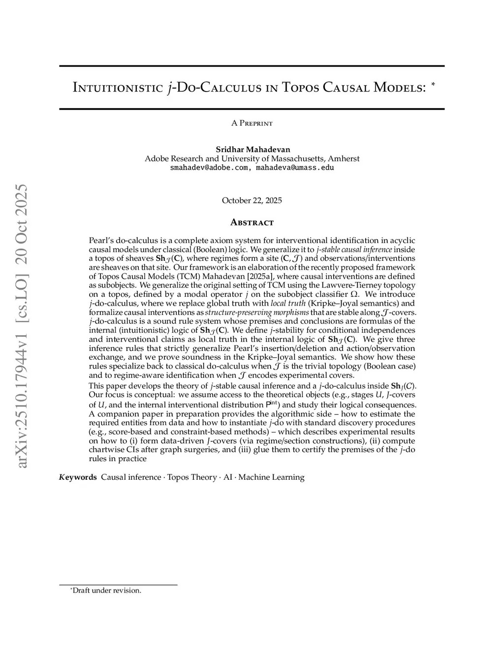 In this paper, we generalize Pearl's do-calculus to an Intuitionistic setting called -stable causal inference inside a topos of sheaves. Our framework is an elaboration of the recently proposed framework of Topos Causal Models (TCMs), where causal interventions are defined as subobjects. We generalize the original setting of TCM using the Lawvere-Tierney topology on a topos, defined by a modal operator on the subobject classifier . We introduce -do-calculus, where we replace global truth with local truth defined by Kripke-Joyal semantics, and formalize causal reasoning as structure-preserving morphisms that are stable along -covers. -do-calculus is a sound rule system whose premises and conclusions are formulas of the internal Intuitionistic logic of the causal topos. We define -stability for conditional independences and interventional claims as local truth in the internal logic of the causal topos. We give three inference rules that mirror Pearl's insertion/deletion and action/observation exchange, and we prove soundness in the Kripke-Joyal semantics. A companion paper in preparation will describe how to estimate the required entities from data and instantiate -do with standard discovery procedures (e.g., score-based and constraint-based methods), and will include experimental results on how to (i) form data-driven -covers (via regime/section constructions), (ii) compute chartwise conditional independences after graph surgeries, and (iii) glue them to certify the premises of the -do rules in practice