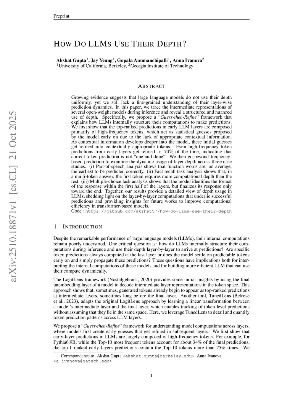 Growing evidence suggests that large language models do not use their depth uniformly, yet we still lack a fine-grained understanding of their layer-wise prediction dynamics. In this paper, we trace the intermediate representations of several open-weight models during inference and reveal a structured and nuanced use of depth. Specifically, we propose a "Guess-then-Refine" framework that explains how LLMs internally structure their computations to make predictions. We first show that the top-ranked predictions in early LLM layers are composed primarily of high-frequency tokens, which act as statistical guesses proposed by the model due to the lack of contextual information. As contextual information develops deeper into the model, these initial guesses get refined into contextually appropriate tokens. We then examine the dynamic usage of layer depth through three case studies. (i) Multiple-choice task analysis shows that the model identifies appropriate options within the first half of the model and finalizes the response in the latter half. (ii) Fact recall task analysis shows that in a multi-token answer, the first token requires more computational depth than the rest. (iii) Part-of-speech analysis shows that function words are, on average, the earliest to be predicted correctly. To validate our results, we supplement probe-based analyses with causal manipulations in the form of activation patching and early-exiting experiments. Together, our results provide a detailed view of depth usage in LLMs, shedding light on the layer-by-layer computations that underlie successful predictions and providing insights for future works to improve computational efficiency in transformer-based models.
