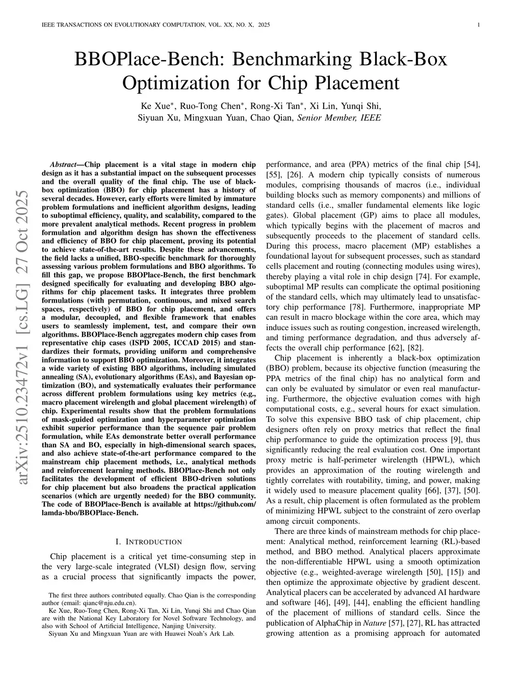 Chip placement is a vital stage in modern chip design as it has a substantial impact on the subsequent processes and the overall quality of the final chip. The use of black-box optimization (BBO) for chip placement has a history of several decades. However, early efforts were limited by immature problem formulations and inefficient algorithm designs. Recent progress has shown the effectiveness and efficiency of BBO for chip placement, proving its potential to achieve state-of-the-art results. Despite these advancements, the field lacks a unified, BBO-specific benchmark for thoroughly assessing various problem formulations and BBO algorithms. To fill this gap, we propose BBOPlace-Bench, the first benchmark designed specifically for evaluating and developing BBO algorithms for chip placement tasks. It integrates three problem formulations of BBO for chip placement, and offers a modular, decoupled, and flexible framework that enables users to seamlessly implement, test, and compare their own algorithms. BBOPlace-Bench integrates a wide variety of existing BBO algorithms, including simulated annealing (SA), evolutionary algorithms (EAs), and Bayesian optimization (BO). Experimental results show that the problem formulations of mask-guided optimization and hyperparameter optimization exhibit superior performance than the sequence pair problem formulation, while EAs demonstrate better overall performance than SA and BO, especially in high-dimensional search spaces, and also achieve state-of-the-art performance compared to the mainstream chip placement methods. BBOPlace-Bench not only facilitates the development of efficient BBO-driven solutions for chip placement but also broadens the practical application scenarios (which are urgently needed) for the BBO community. The code of BBOPlace-Bench is available atthis https URL.