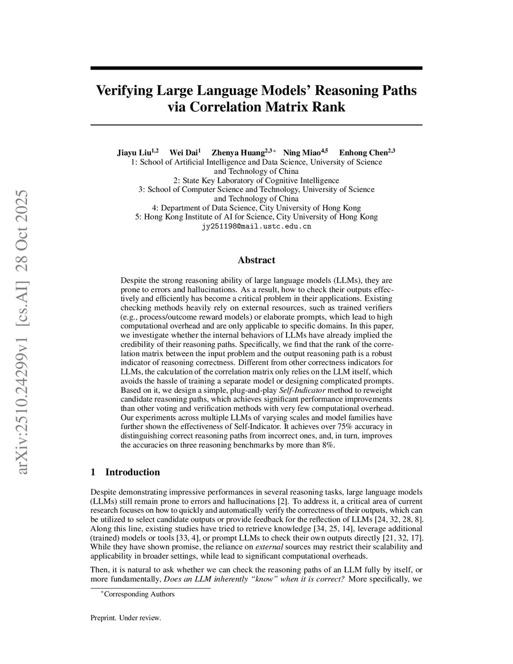 Despite the strong reasoning ability of large language models~(LLMs), they are prone to errors and hallucinations. As a result, how to check their outputs effectively and efficiently has become a critical problem in their applications. Existing checking methods heavily rely on external resources, such as trained verifiers (e.g., process/outcome reward models) or elaborate prompts, which lead to high computational overhead and are only applicable to specific domains. In this paper, we investigate whether the internal behaviors of LLMs have already implied the credibility of their reasoning paths. Specifically, we find that the rank of the correlation matrix between the input problem and the output reasoning path is a robust indicator of reasoning correctness. Different from other correctness indicators for LLMs, the calculation of the correlation matrix only relies on the LLM itself, which avoids the hassle of training a separate model or designing complicated prompts. Based on it, we design a simple, plug-and-play Self-Indicator method to reweight candidate reasoning paths, which achieves significant performance improvements than other voting and verification methods with very few computational overhead. Our experiments across multiple LLMs of varying scales and model families have further shown the effectiveness of Self-Indicator. It achieves over 75% accuracy in distinguishing correct reasoning paths from incorrect ones, and, in turn, improves the accuracies on three reasoning benchmarks by more than 8%.