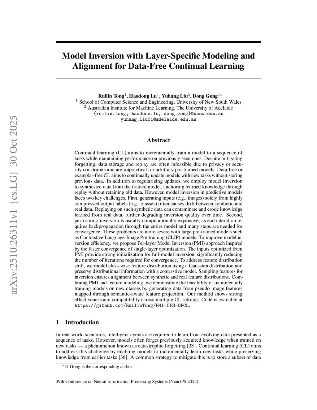 Continual learning (CL) aims to incrementally train a model on a sequence of tasks while retaining performance on prior ones. However, storing and replaying data is often infeasible due to privacy or security constraints and impractical for arbitrary pre-trained models. Data-free CL seeks to update models without access to previous data. Beyond regularization, we employ model inversion to synthesize data from the trained model, enabling replay without storing samples. Yet, model inversion in predictive models faces two challenges: (1) generating inputs solely from compressed output labels causes drift between synthetic and real data, and replaying such data can erode prior knowledge; (2) inversion is computationally expensive since each step backpropagates through the full model. These issues are amplified in large pre-trained models such as CLIP. To improve efficiency, we propose Per-layer Model Inversion (PMI), inspired by faster convergence in single-layer optimization. PMI provides strong initialization for full-model inversion, substantially reducing iterations. To mitigate feature shift, we model class-wise features via Gaussian distributions and contrastive model, ensuring alignment between synthetic and real features. Combining PMI and feature modeling, our approach enables continual learning of new classes by generating pseudo-images from semantic-aware projected features, achieving strong effectiveness and compatibility across multiple CL settings.