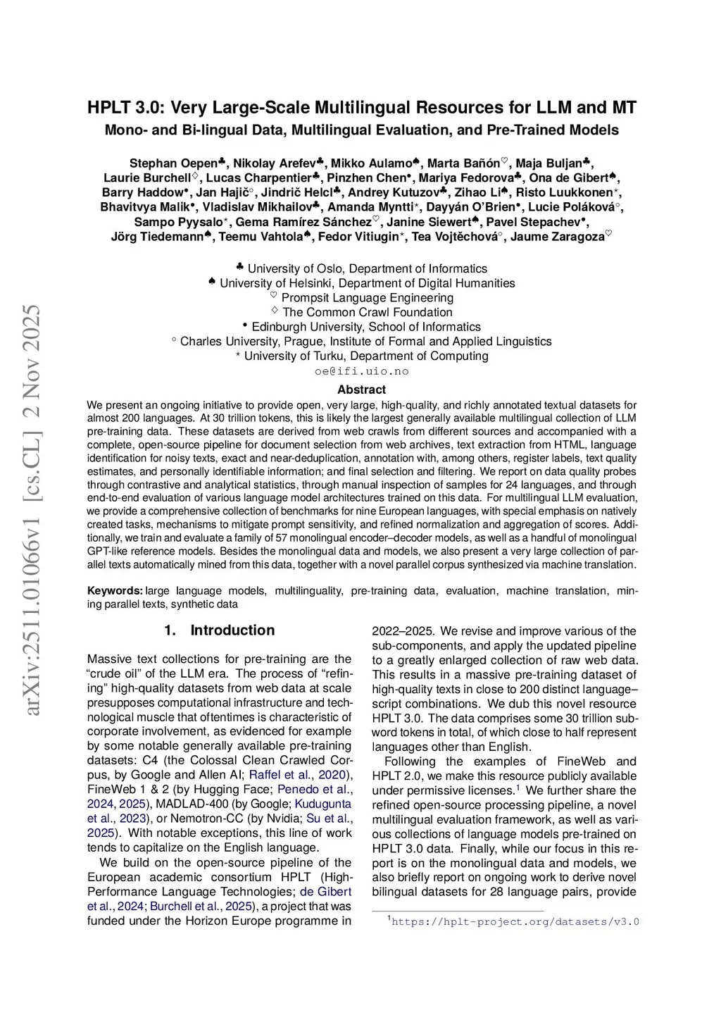 We present an ongoing initiative to provide open, very large, high-quality, and richly annotated textual datasets for almost 200 languages. At 30 trillion tokens, this is likely the largest generally available multilingual collection of LLM pre-training data. These datasets are derived from web crawls from different sources and accompanied with a complete, open-source pipeline for document selection from web archives, text extraction from HTML, language identification for noisy texts, exact and near-deduplication, annotation with, among others, register labels, text quality estimates, and personally identifiable information; and final selection and filtering. We report on data quality probes through contrastive and analytical statistics, through manual inspection of samples for 24 languages, and through end-to-end evaluation of various language model architectures trained on this data. For multilingual LLM evaluation, we provide a comprehensive collection of benchmarks for nine European languages, with special emphasis on natively created tasks, mechanisms to mitigate prompt sensitivity, and refined normalization and aggregation of scores. Additionally, we train and evaluate a family of 57 monolingual encoder-decoder models, as well as a handful of monolingual GPT-like reference models. Besides the monolingual data and models, we also present a very large collection of parallel texts automatically mined from this data, together with a novel parallel corpus synthesized via machine translation.