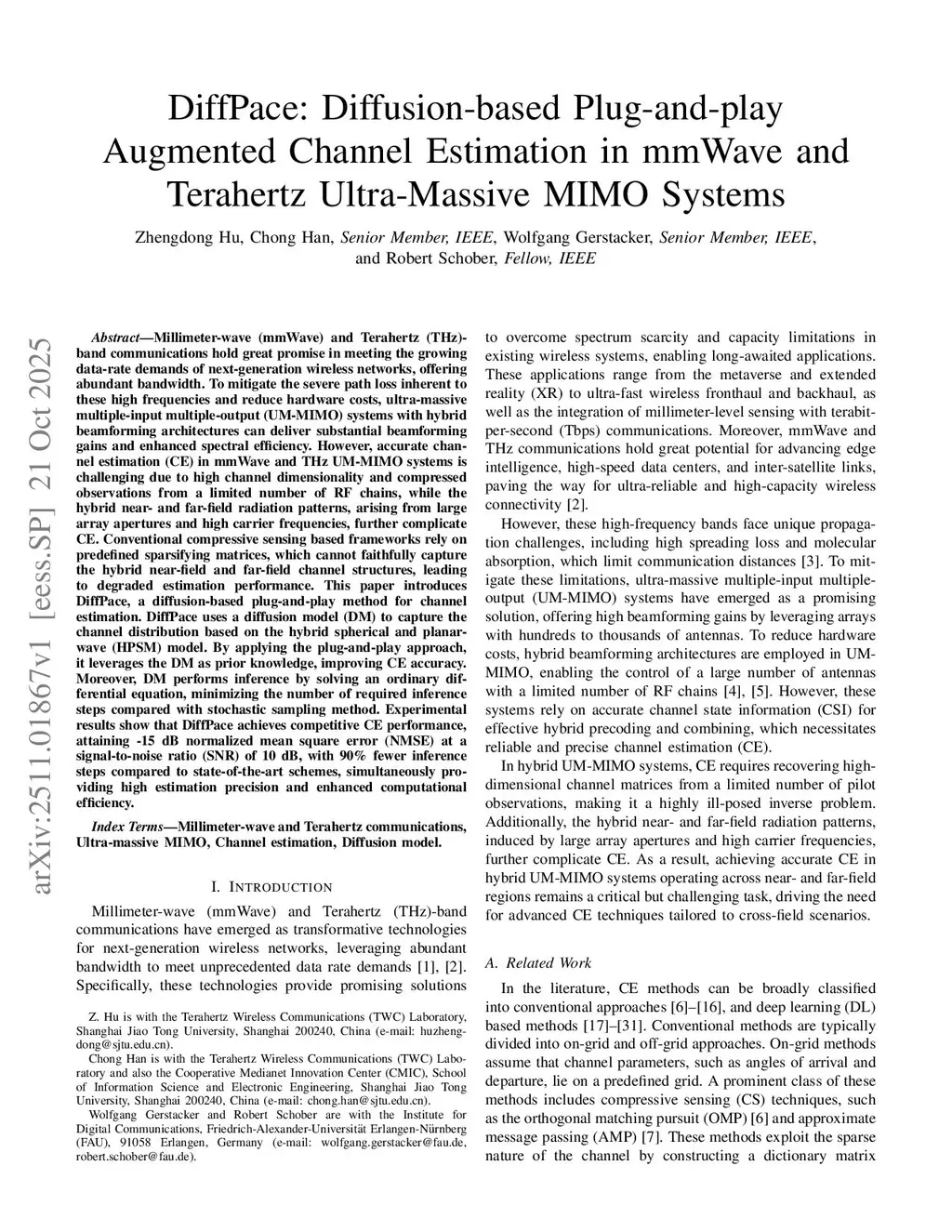 Millimeter-wave (mmWave) and Terahertz (THz)-band communications hold great promise in meeting the growing data-rate demands of next-generation wireless networks, offering abundant bandwidth. To mitigate the severe path loss inherent to these high frequencies and reduce hardware costs, ultra-massive multiple-input multiple-output (UM-MIMO) systems with hybrid beamforming architectures can deliver substantial beamforming gains and enhanced spectral efficiency. However, accurate channel estimation (CE) in mmWave and THz UM-MIMO systems is challenging due to high channel dimensionality and compressed observations from a limited number of RF chains, while the hybrid near- and far-field radiation patterns, arising from large array apertures and high carrier frequencies, further complicate CE. Conventional compressive sensing based frameworks rely on predefined sparsifying matrices, which cannot faithfully capture the hybrid near-field and far-field channel structures, leading to degraded estimation performance. This paper introduces DiffPace, a diffusion-based plug-and-play method for channel estimation. DiffPace uses a diffusion model (DM) to capture the channel distribution based on the hybrid spherical and planar-wave (HPSM) model. By applying the plug-and-play approach, it leverages the DM as prior knowledge, improving CE accuracy. Moreover, DM performs inference by solving an ordinary differential equation, minimizing the number of required inference steps compared with stochastic sampling method. Experimental results show that DiffPace achieves competitive CE performance, attaining -15 dB normalized mean square error (NMSE) at a signal-to-noise ratio (SNR) of 10 dB, with 90\% fewer inference steps compared to state-of-the-art schemes, simultaneously providing high estimation precision and enhanced computational efficiency.