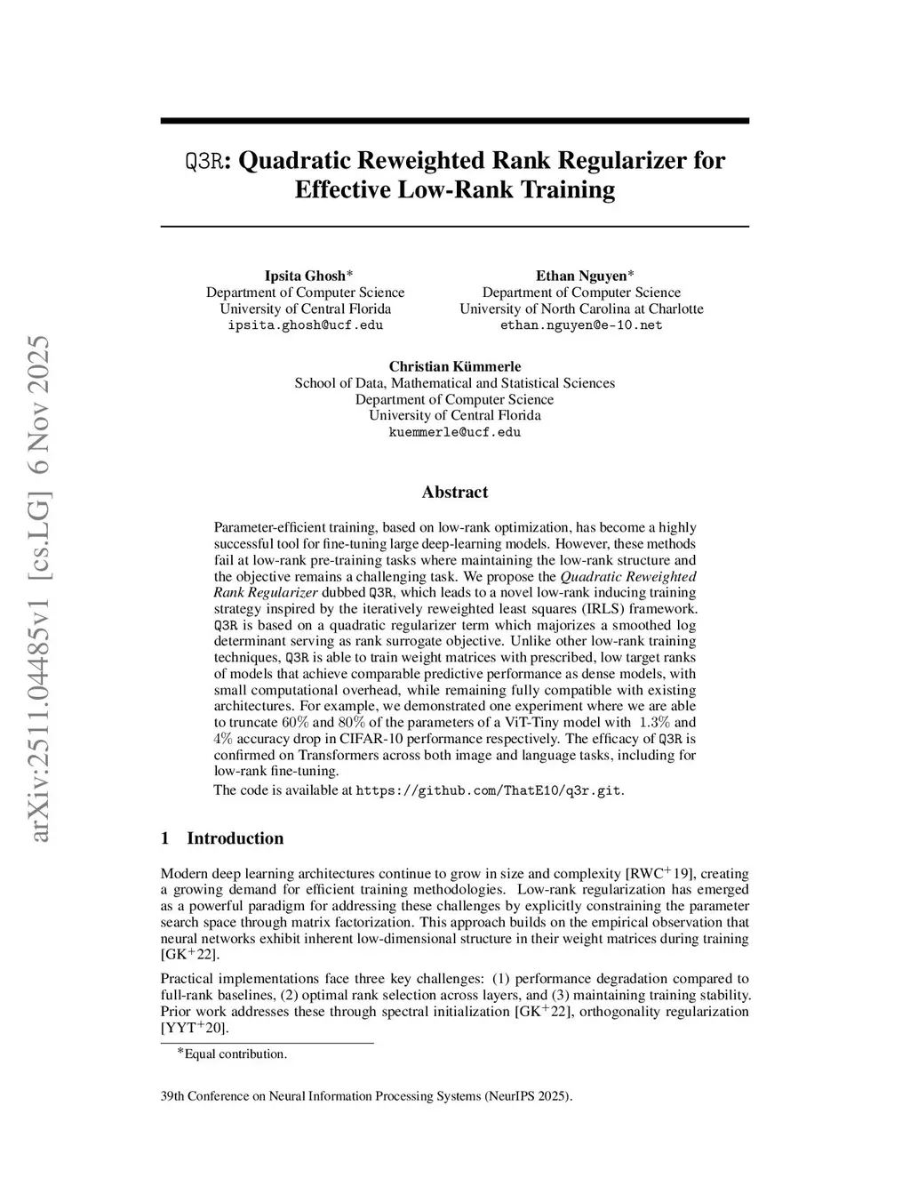 Q3R: Quadratic Reweighted Rank Regularizer for Effective Low-Rank Training