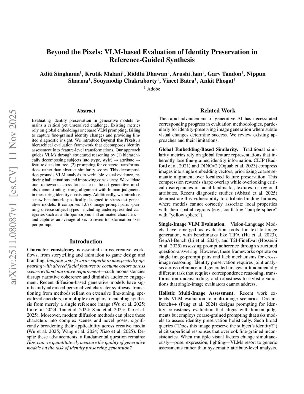 Evaluating identity preservation in generative models remains a critical yet unresolved challenge. Existing metrics rely on global embeddings or coarse VLM prompting, failing to capture fine-grained identity changes and providing limited diagnostic insight. We introduce Beyond the Pixels, a hierarchical evaluation framework that decomposes identity assessment into feature-level transformations. Our approach guides VLMs through structured reasoning by (1) hierarchically decomposing subjects into (type, style) -> attribute -> feature decision tree, and (2) prompting for concrete transformations rather than abstract similarity scores. This decomposition grounds VLM analysis in verifiable visual evidence, reducing hallucinations and improving consistency. We validate our framework across four state-of-the-art generative models, demonstrating strong alignment with human judgments in measuring identity consistency. Additionally, we introduce a new benchmark specifically designed to stress-test generative models. It comprises 1,078 image-prompt pairs spanning diverse subject types, including underrepresented categories such as anthropomorphic and animated characters, and captures an average of six to seven transformation axes per prompt.